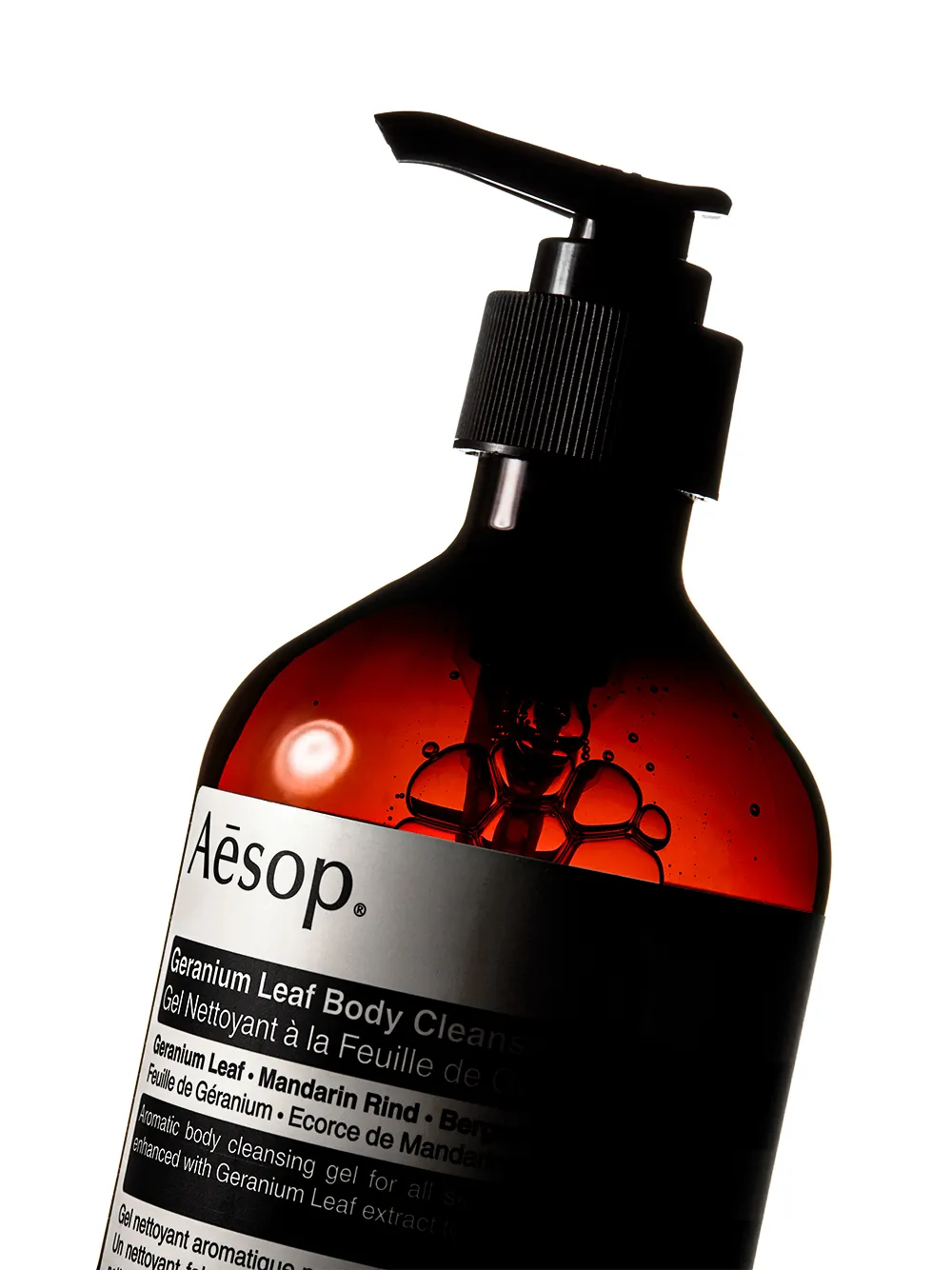 Das Geranium Leaf Duschgel von Aesop ist mit Ölen von Mandarine und Bergamotte und wilder Geranie angereichert. Sie reinigt die Haut sanft, bringt gleichzeitig ihren Feuchtigkeitshaushalt in Balance und hat einen Aromatherapie-Effekt.