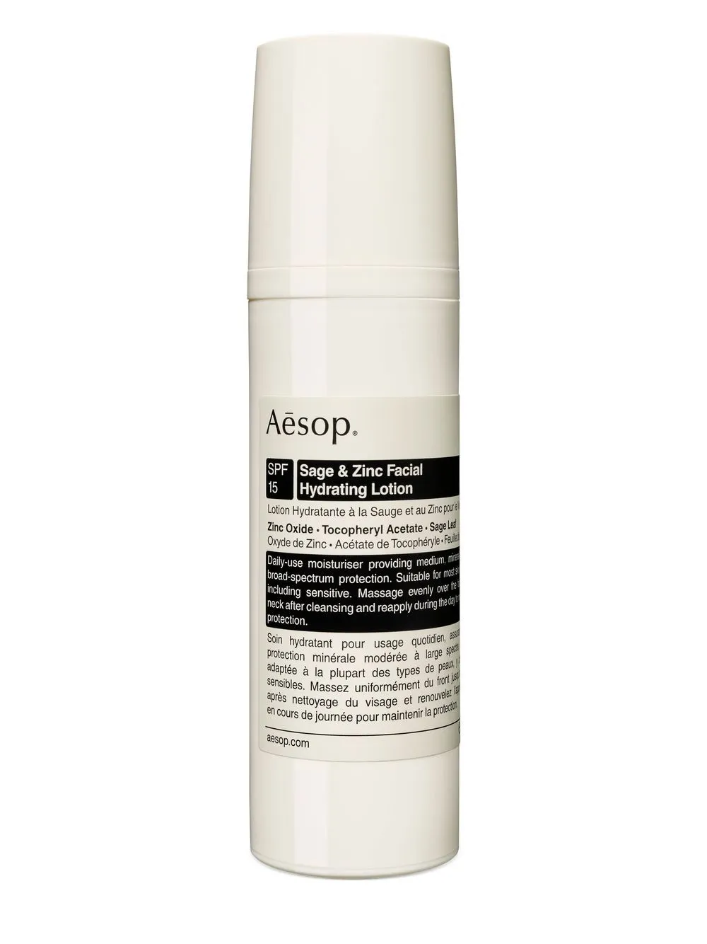 Die Sage & Zinc Facial Hydrating Lotion LSF15 von Aesop spendet Feuchtigkeit und bietet UV-Schutz in einem Schritt. Zinkoxid auf Mineralienbasis bildet eine physikalische Barriere, die UVA- und UVB-Strahlen reflektiert, während eine Mischung aus Salbeiblatt-, Nachtkerzen- und Lavendelöl die Haut nährt und klärt.