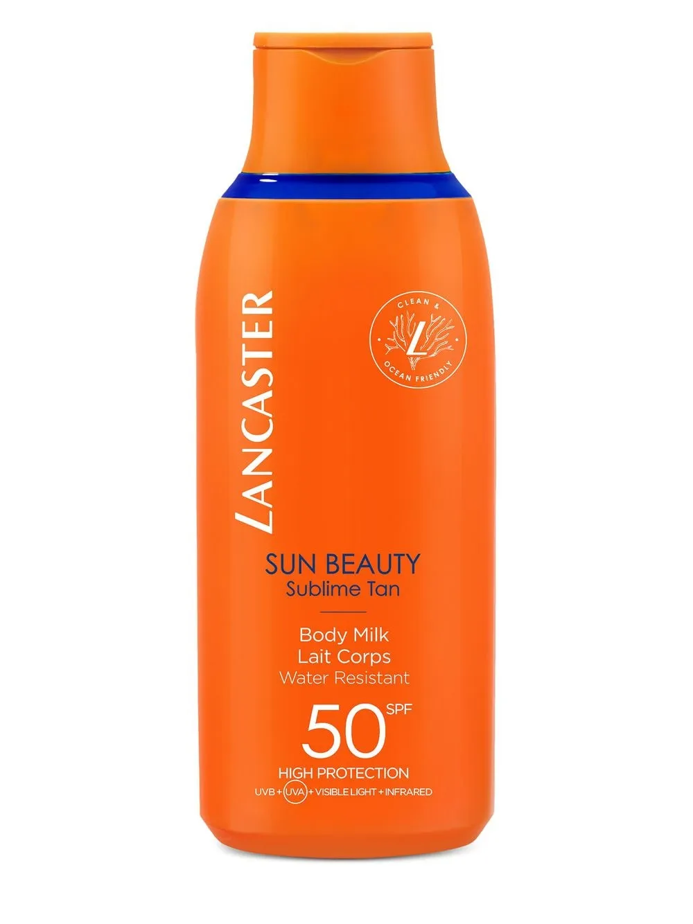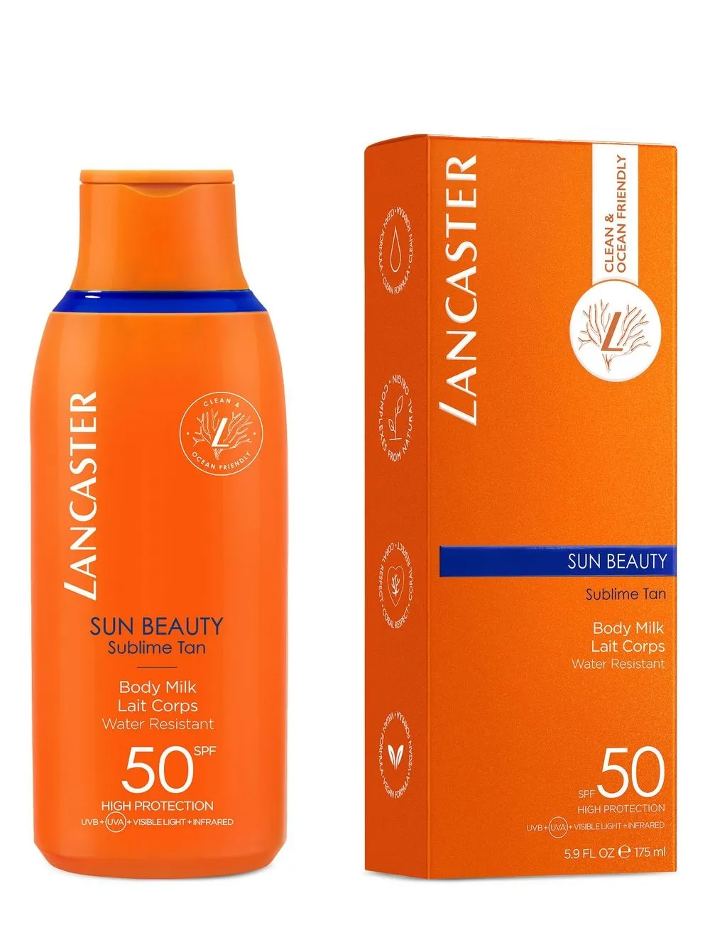 Die Body Milk SPF50 von Lancaster Beauty hat eine milchige Textur und deckt 100% des Sonnenspektrums ab. Der sensorische Sonnenschutz hilft mit seiner Milchsäureformel dabei, die Haut vor sonnenbedingten Schäden zu schützen. Er ist leicht, nicht fettend und dabei auf der Haut unsichtbar.