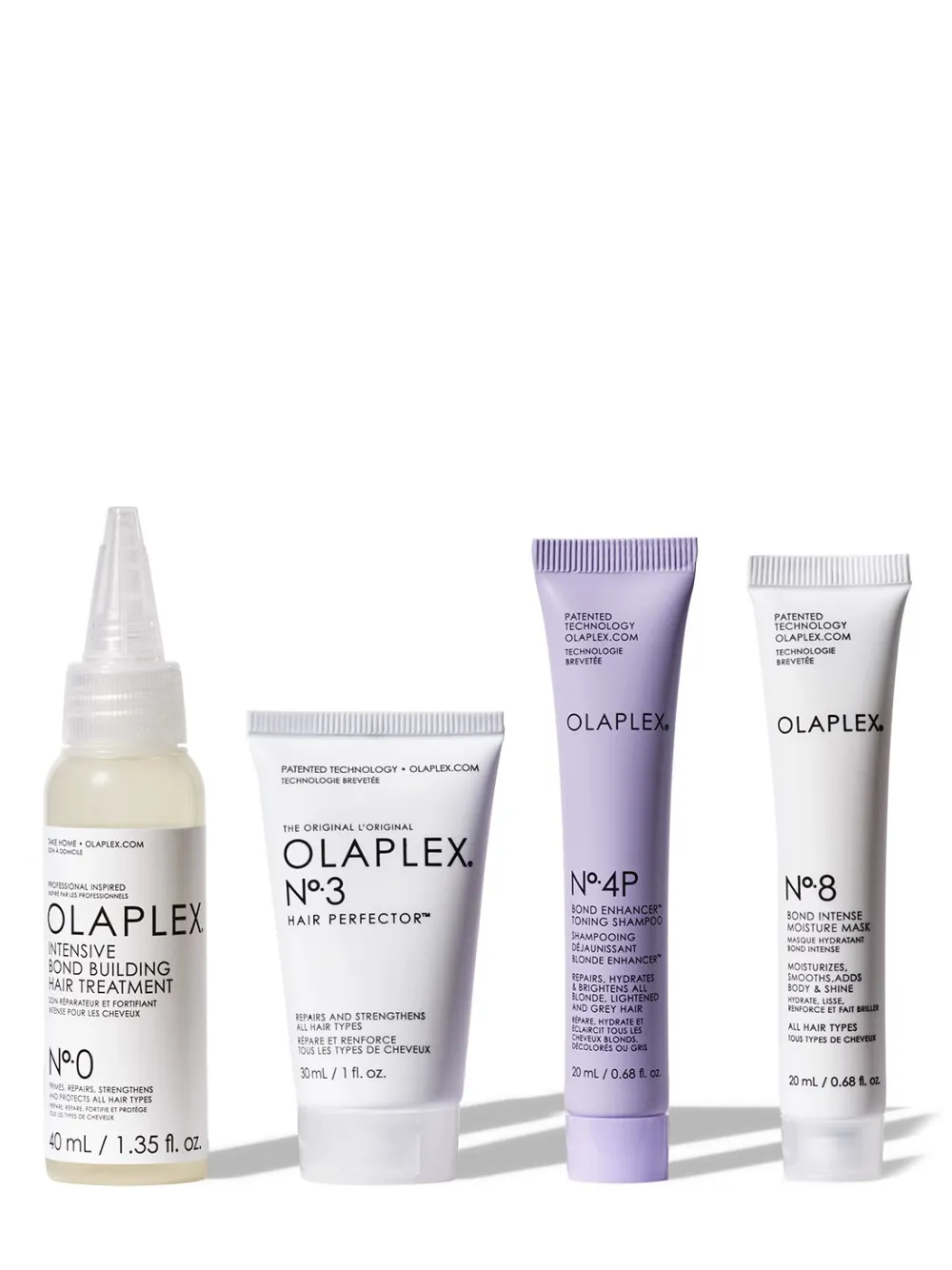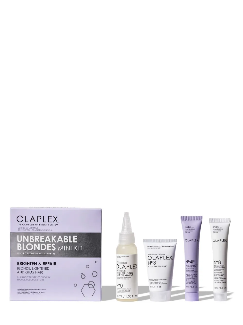 Das Miniset Unbreakable Blondes von OLAPLEX wurde speziell entwickelt, um blondes, aufgehelltes und graues Haar zu illuminieren und zu pflegen. Das zweiteilige System aus Nº.0 und Nº.3 regeneriert und verhindert Schäden, während das Haar gestärkt wird. Shampoo Nº.4P neutralisiert gelbe Untertöne und die intensive Feuchtigkeitsmaske Nº.8 schließt die Pflege ab, indem sie das Haar wiederherstellt und mit Feuchtigkeit versorgt.