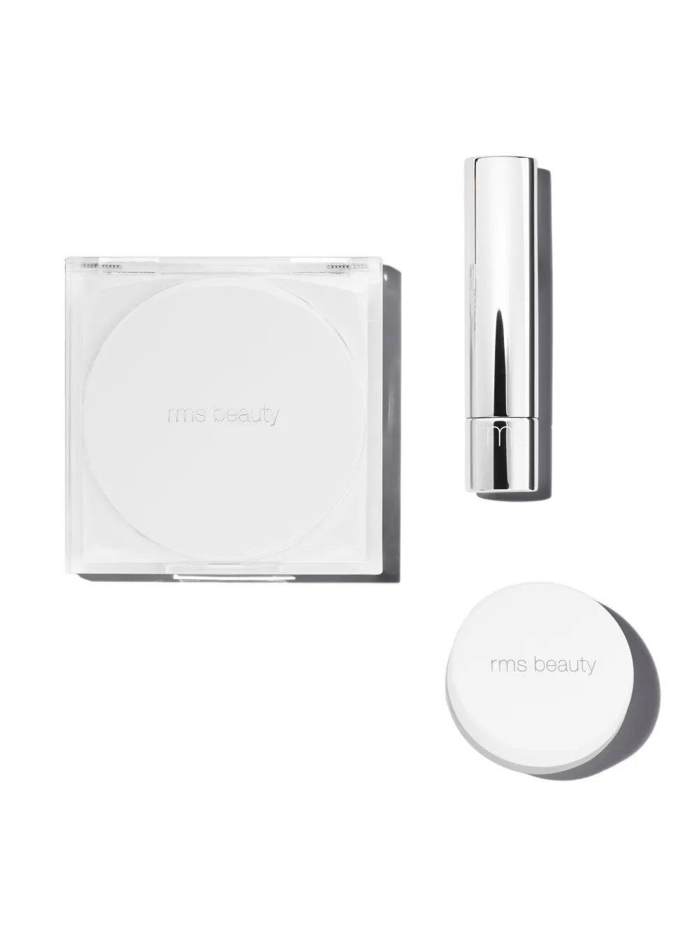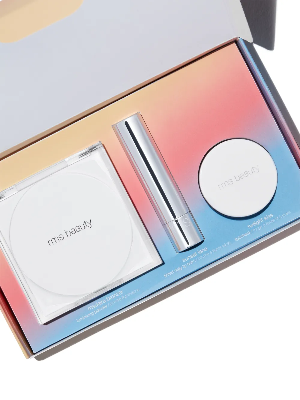 Die Eternal Sunset Collection von RMS Beauty ist ein limitiertes Geschenkset, das den Tinted Daily Lip Balm, Lip2cheek und Luminizing Powder der Marke enthält. Die Produkte enthalten Leuchtpigmente und feuchtigkeitsspendende Inhaltsstoffe, die für ein strahlendes Finish auf der Haut sorgen und eine erfrischende Wirkung haben.