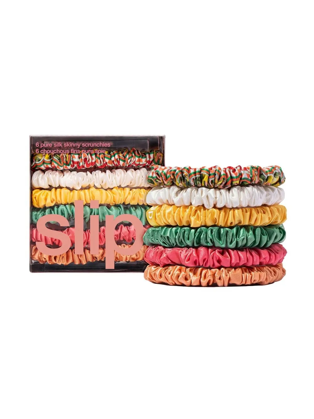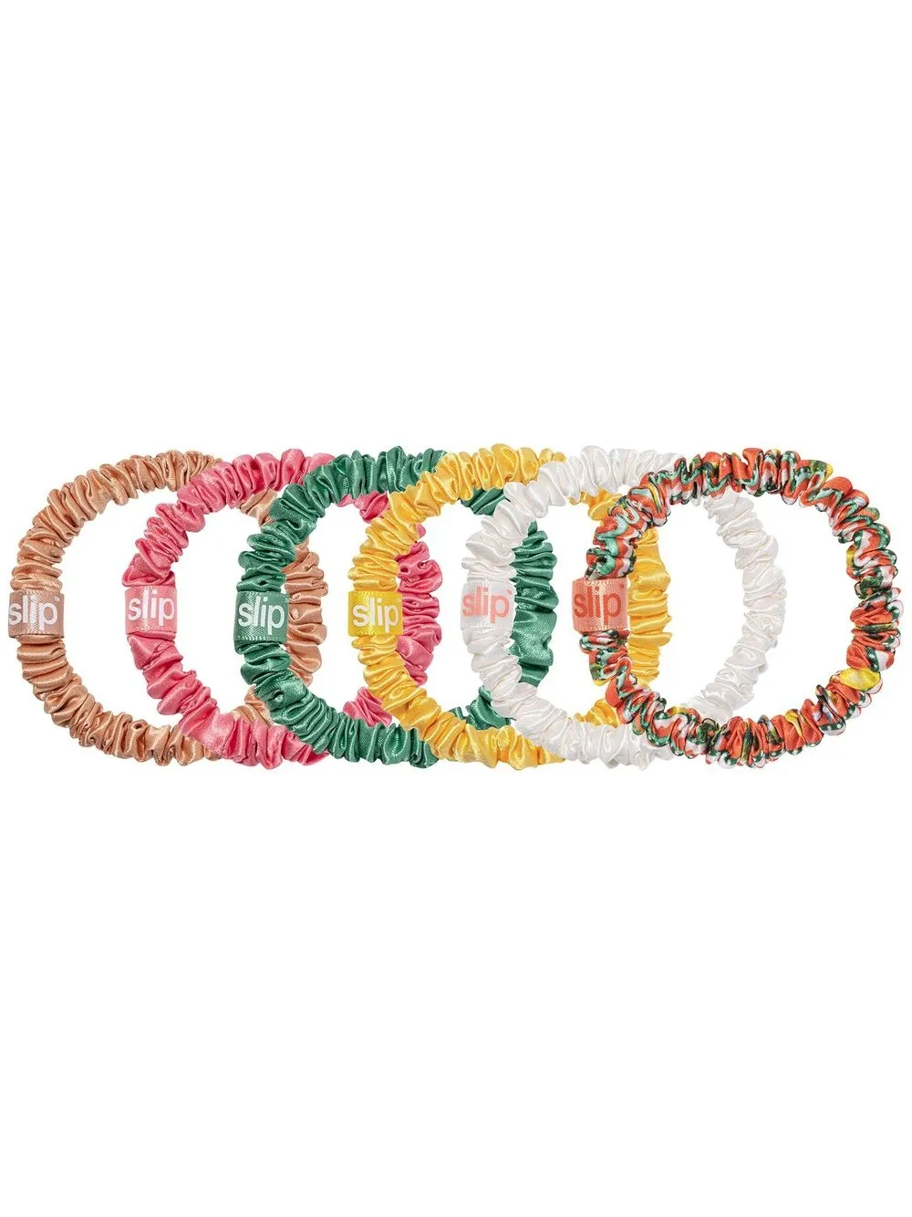 six-pack La Dolce Vita skinny scrunchies from Slip featuring multicolour, silk, ruched detailing, slip-on style and pack of six.