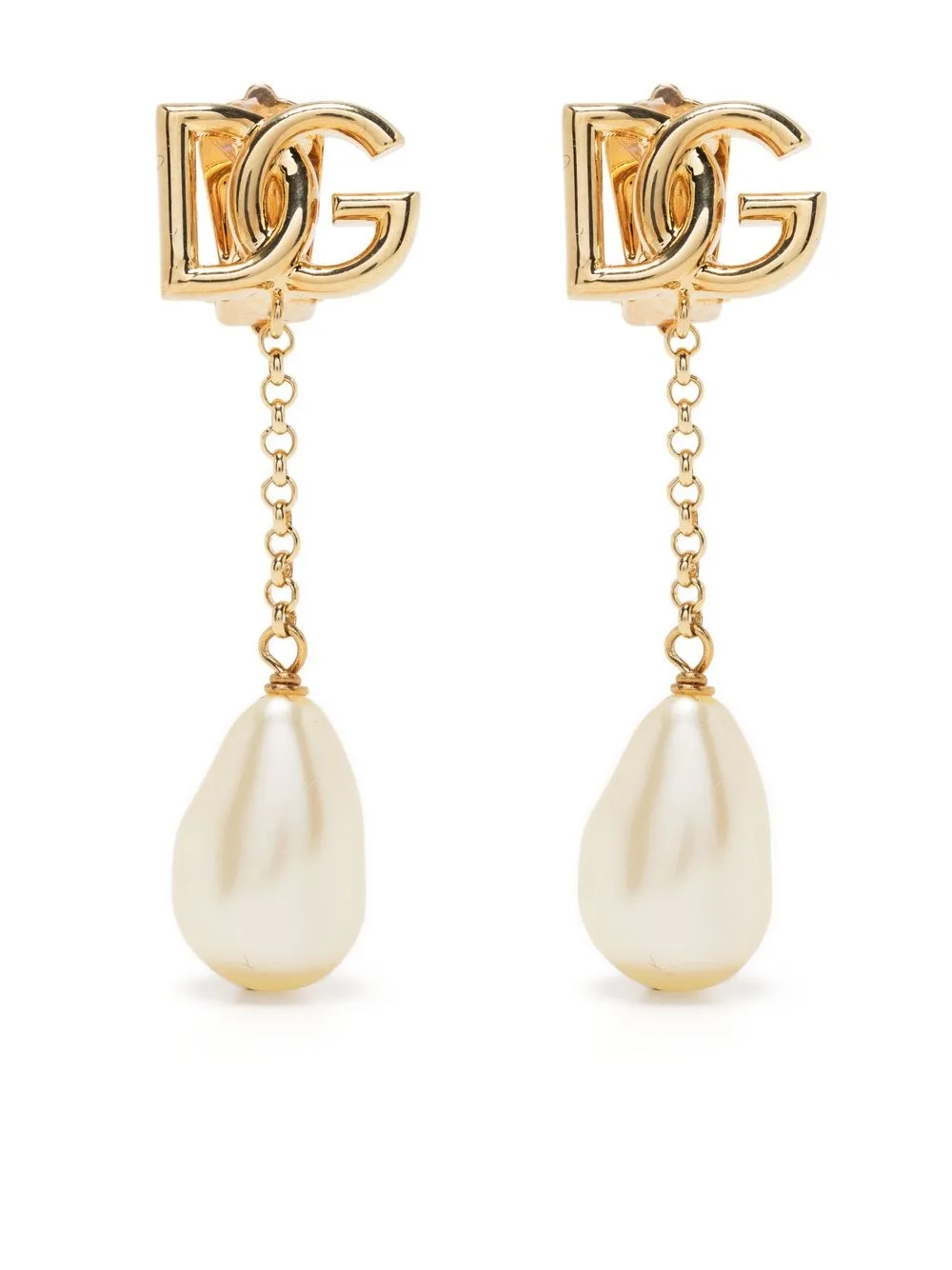 Goldfarben, Messing, Tropfendesign, Logo-Schild, Kettendetails, Kunstperlen, Clipverschluss hinten. Bitte beachten Sie, dass dieser Ohrschmuck als Paar geliefert wird.