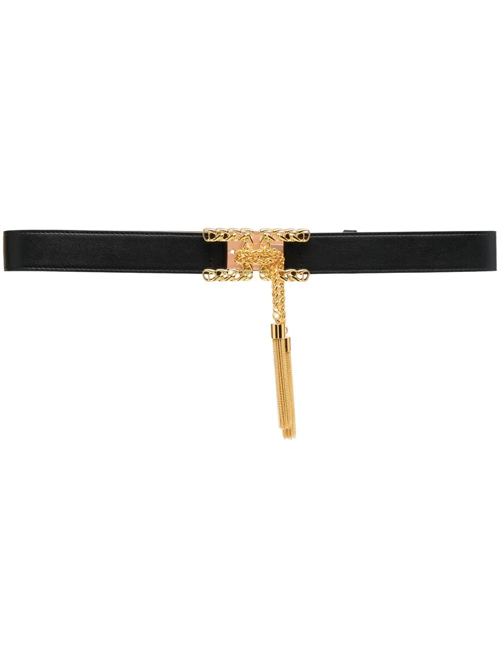 Schwarz, Faux-Leder, goldfarbene Beschläge, Kettendetails, Saum mit Quasten, Logo-Schild, vorgestanzte Löcher, variable Passform.