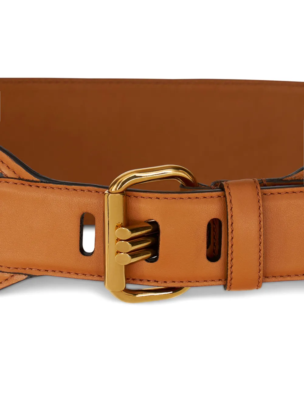 Braun, Kalbsleder, bestickt, goldfarbene Beschläge, Schnallenverschluss, vorgestanzte Löcher, spitze Spitze.