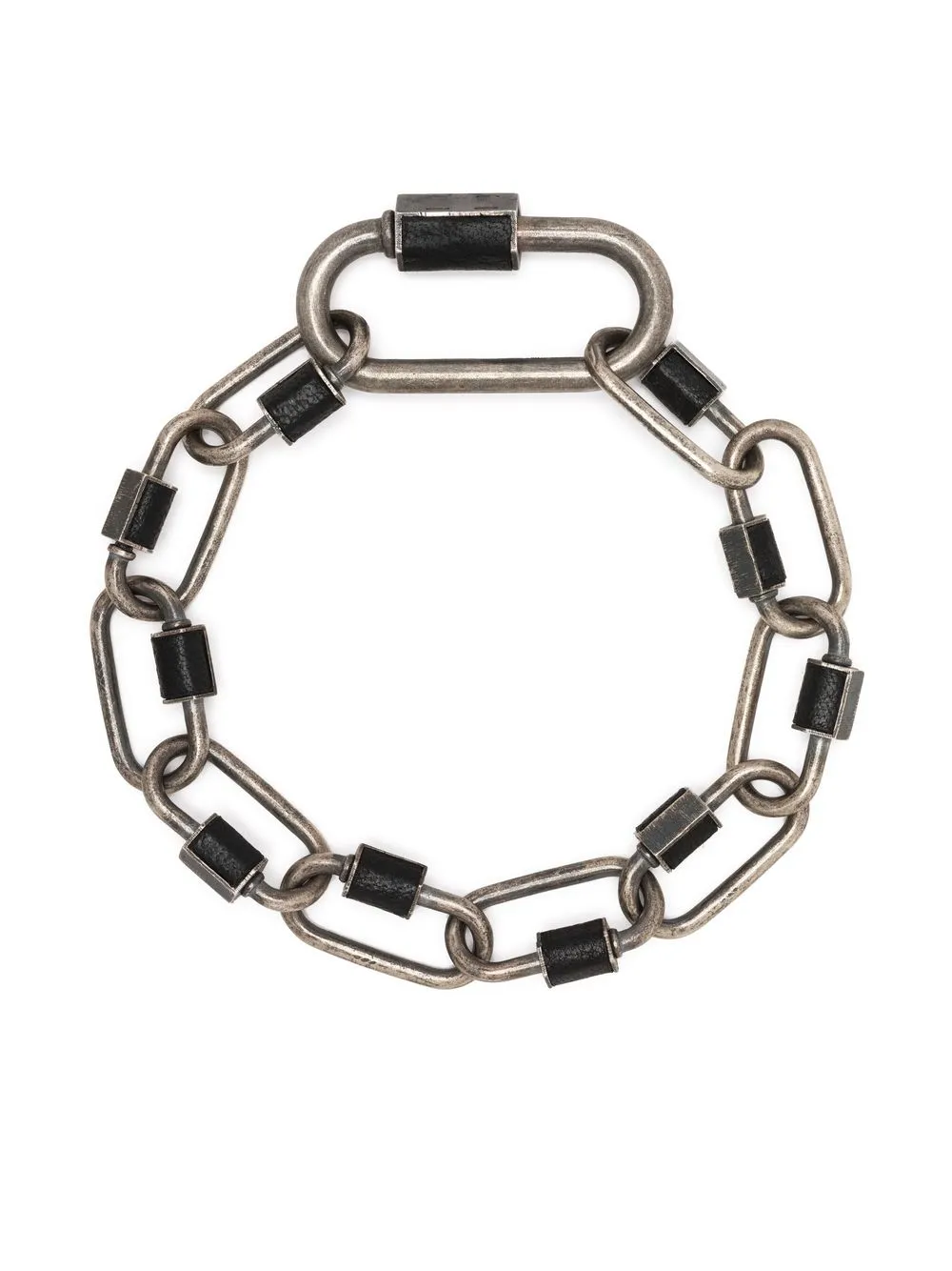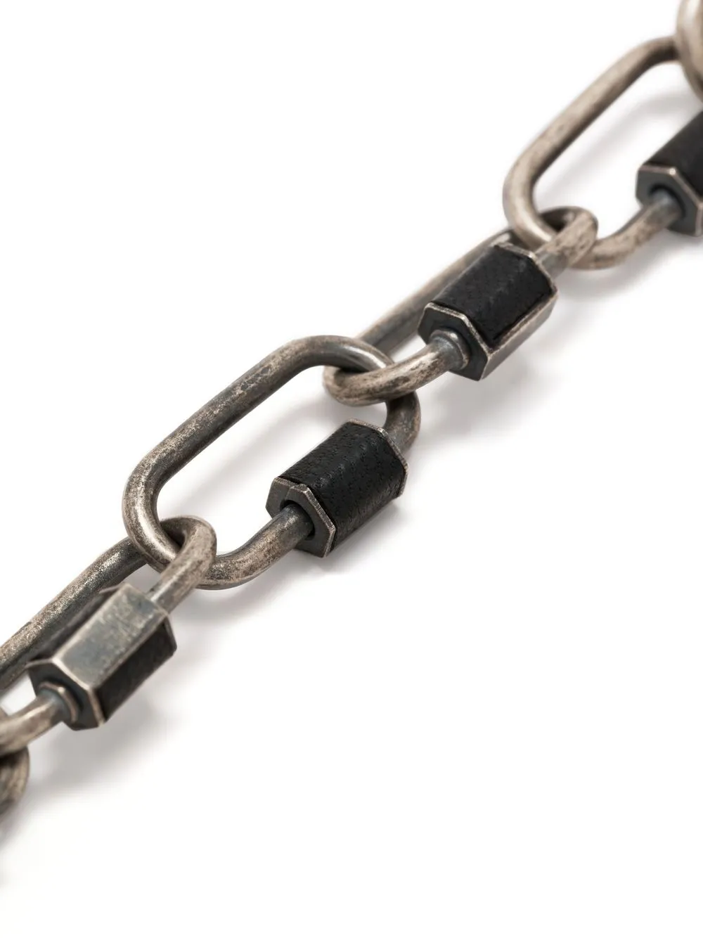 Silberfarbene Beschläge, Distressed-Finish, Kettendetails.