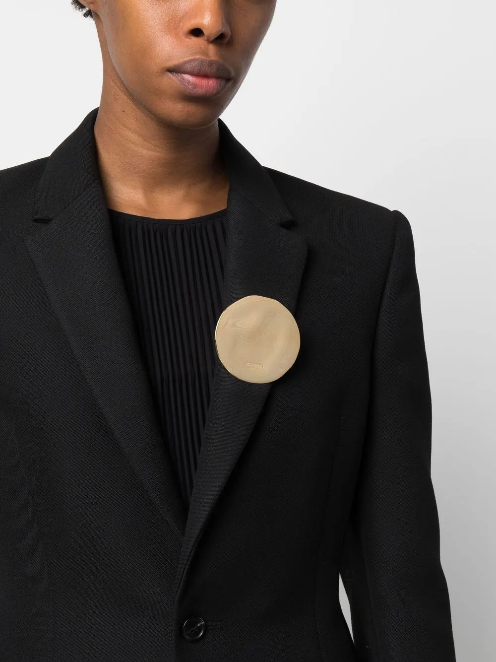 Goldfarben, Silber, rundes Gestell, Logo-Prägung vorne, Steckverschluss.