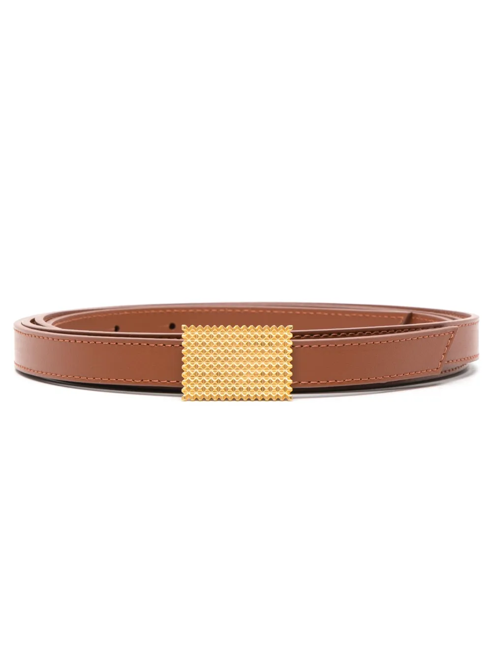Kalbsleder, goldfarbener Schnallenverschluss, vorgestanzte Löcher, variable Passform.