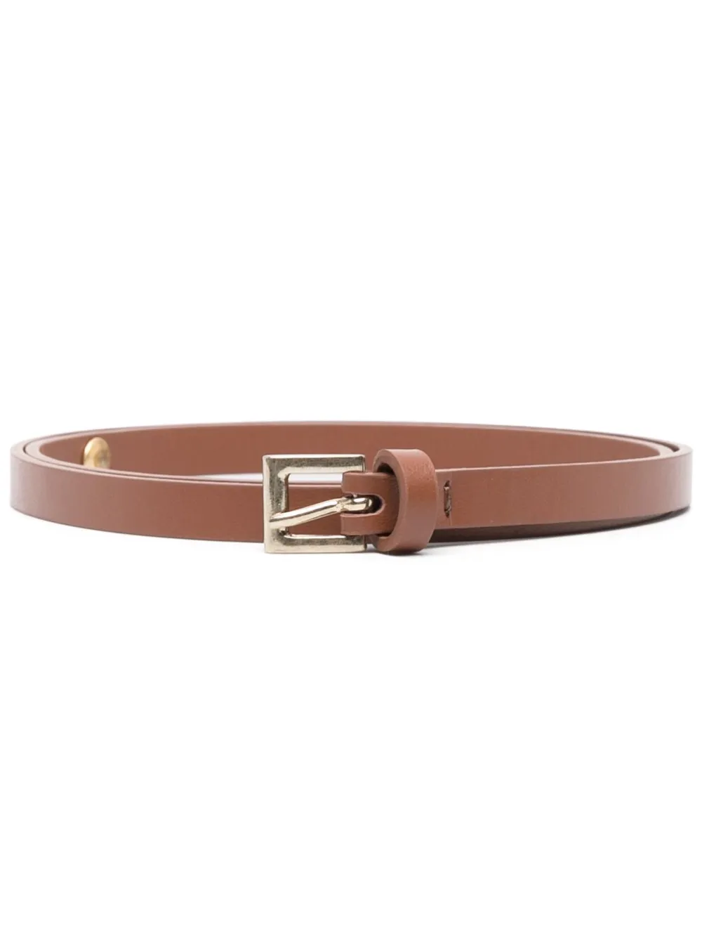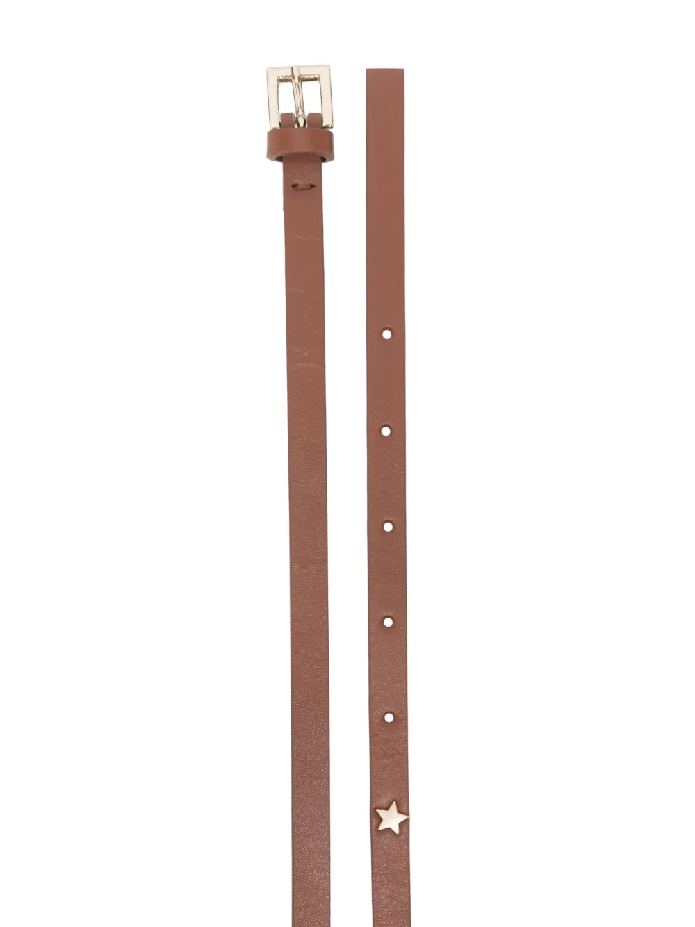 Hellbraun, Kalbsleder, sternförmige Nieten, goldfarbene Beschläge, Schnallenverschluss, vorgestanzte Löcher, variable Passform.