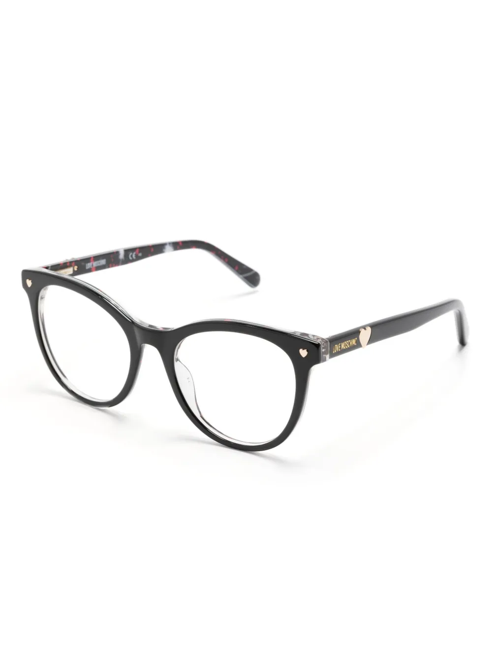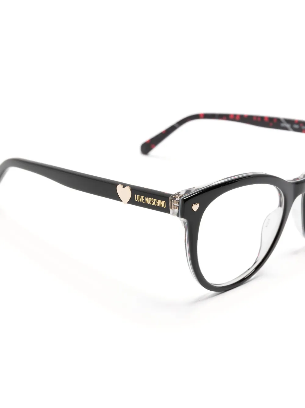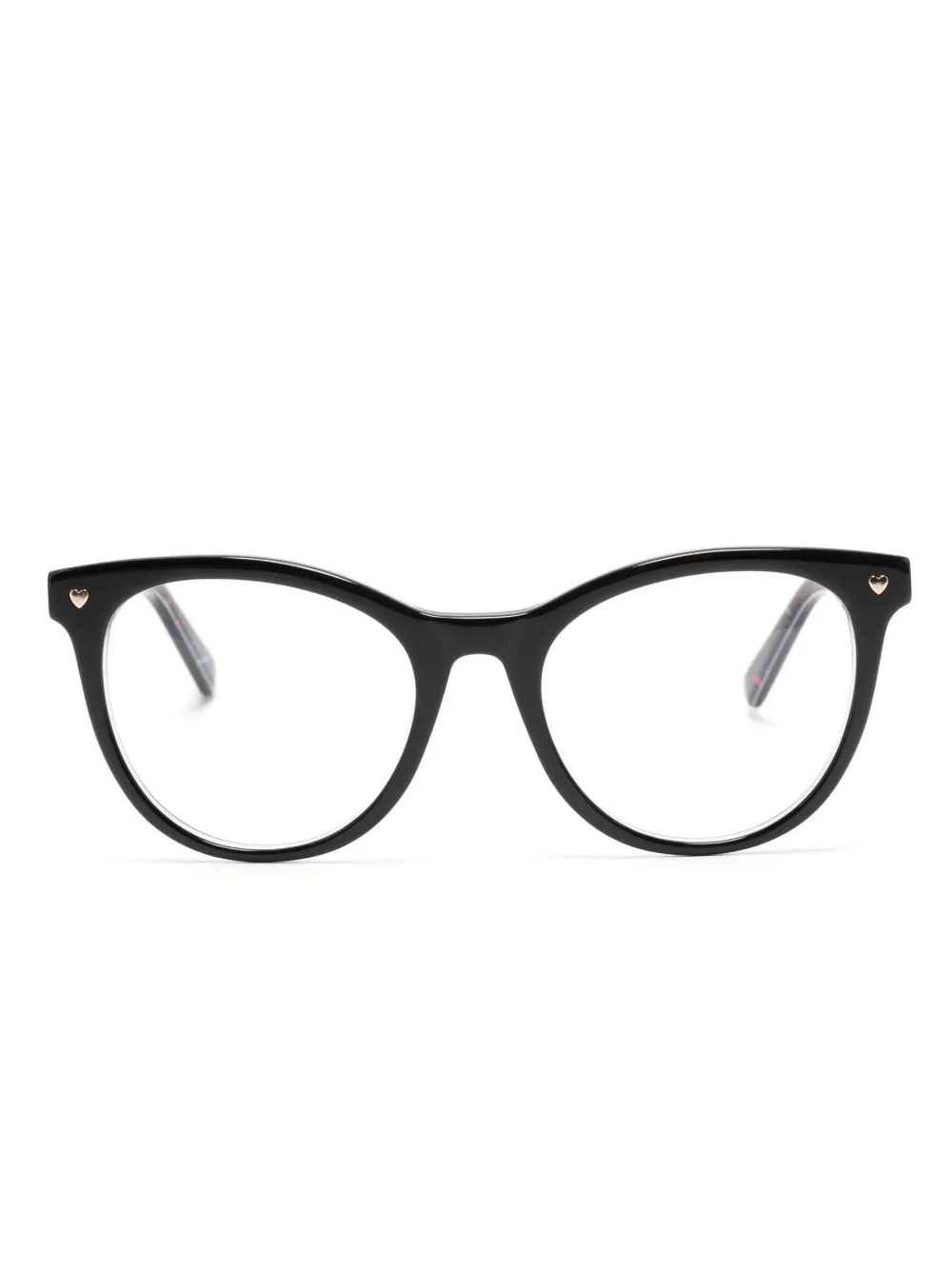 Schwarz, Azetat, klare Gläser, rundes Gestell, Bügel mit Logo-Gravur, Herz-Motiv, Nasenpads, gerade Bügel, abgerundete Enden. Alle Brillen von FARFETCH werden als Brillengestelle ohne Sehstärke verkauft. Diese Brille wird mit einer Schutzhülle geliefert.