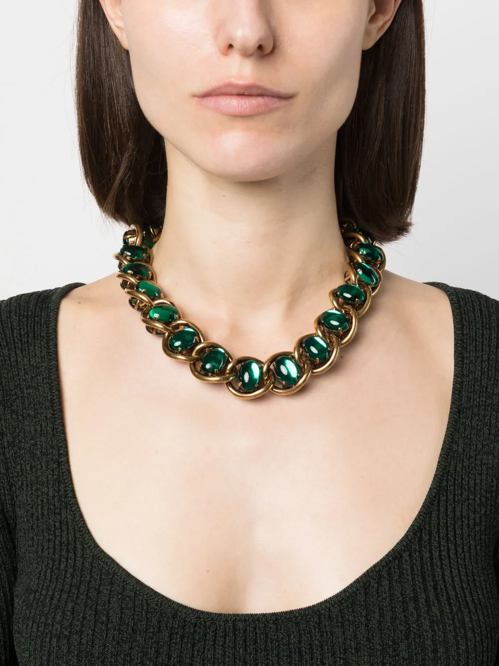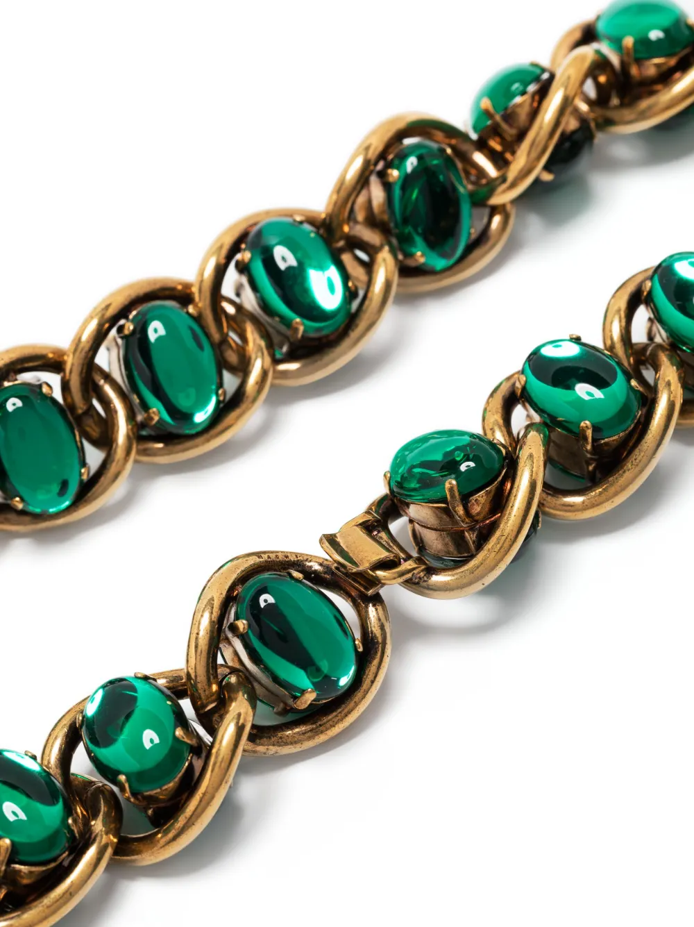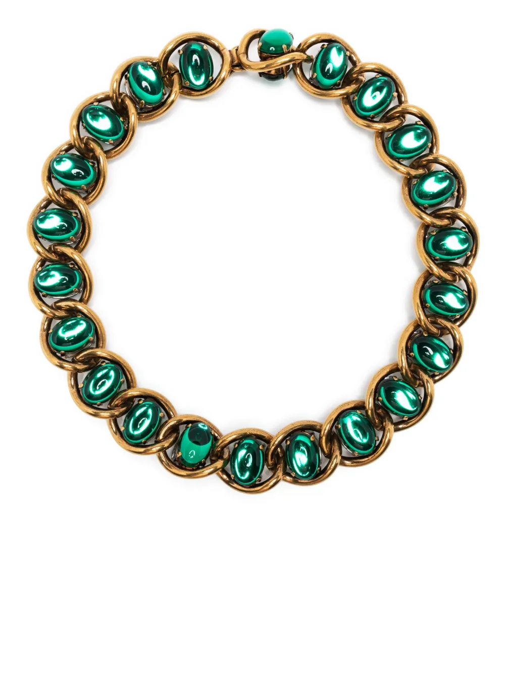 Smaragdgrün, goldfarbene Beschläge, Kristallglasverzierung, Krappenfassung, Beschläge mit Antik-Effekt, Choker, Haken- und Ösenverschluss hinten. Ihre Bestellung ist geschenkverpackt.