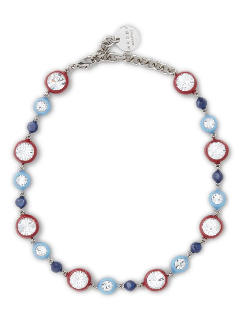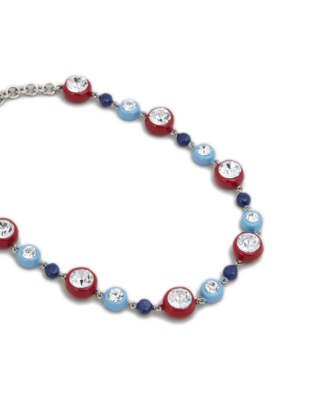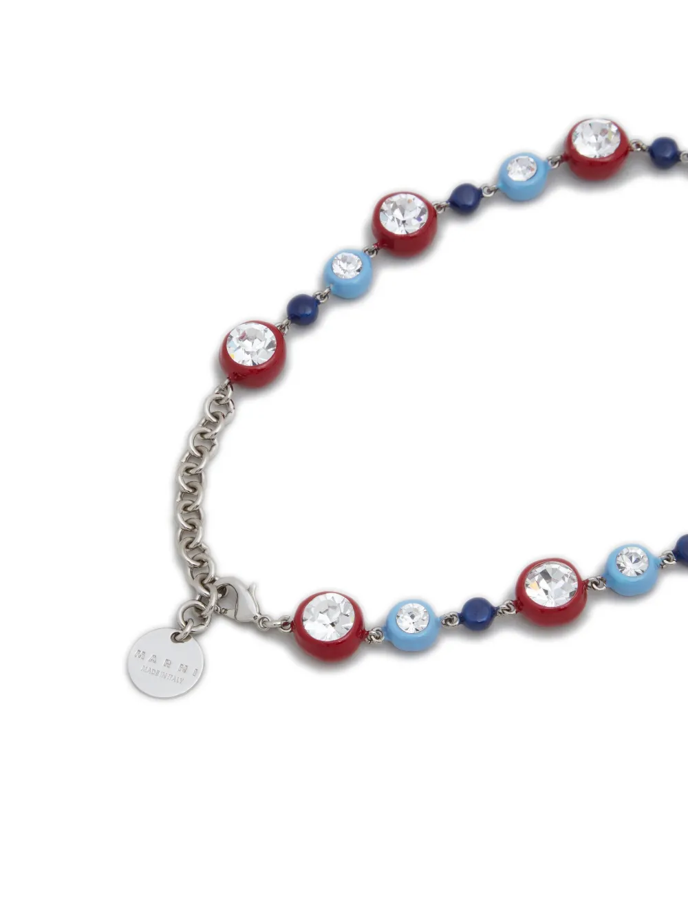 Marineblau, Blutrot, Messing, Kristallglasverzierung, Perlenverzierung, eingraviertes Logo, Karabinerverschluss.