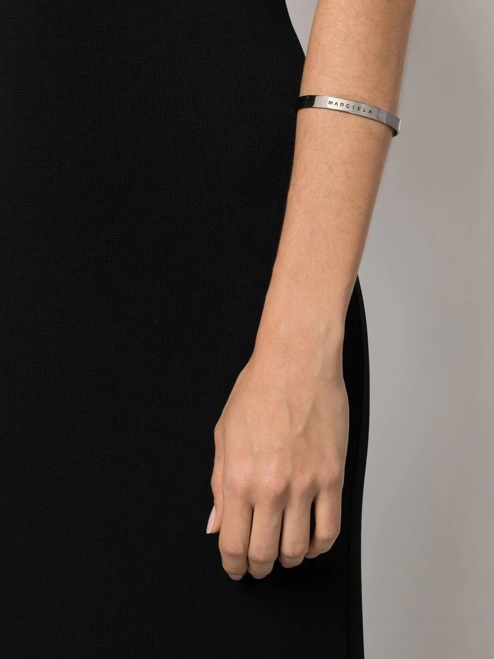 Silber, Messing, eingraviertes Logo, offener Armreif, silberfarbene Beschläge.