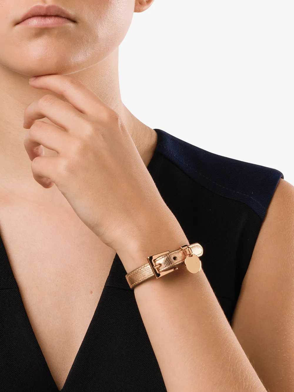 Saffiano-Armband von Prada mit folgenden Eigenschaften: Schnallenverschluss und Logo-Anhänger.