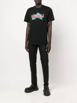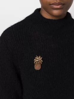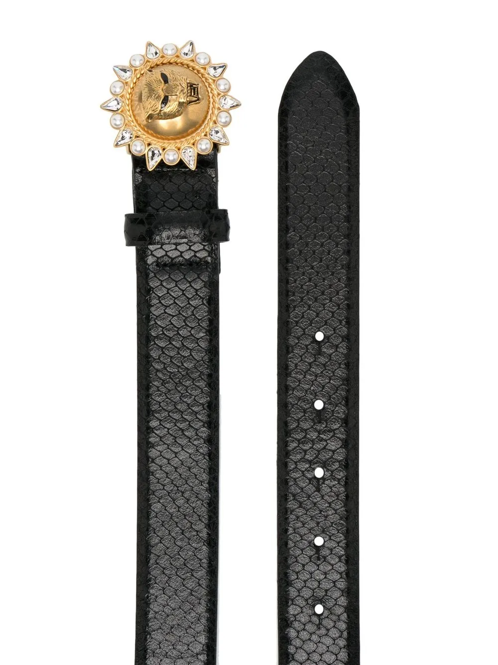 Schwarz, Kalbsleder, Schlangen-Effekt, goldfarbene Beschläge, mit Kunstperlen besetzt, Kristallverzierung, ikonisches Tigerkopfmotiv, Druckknopfverschluss, vorgestanzte Löcher, spitze Spitze.