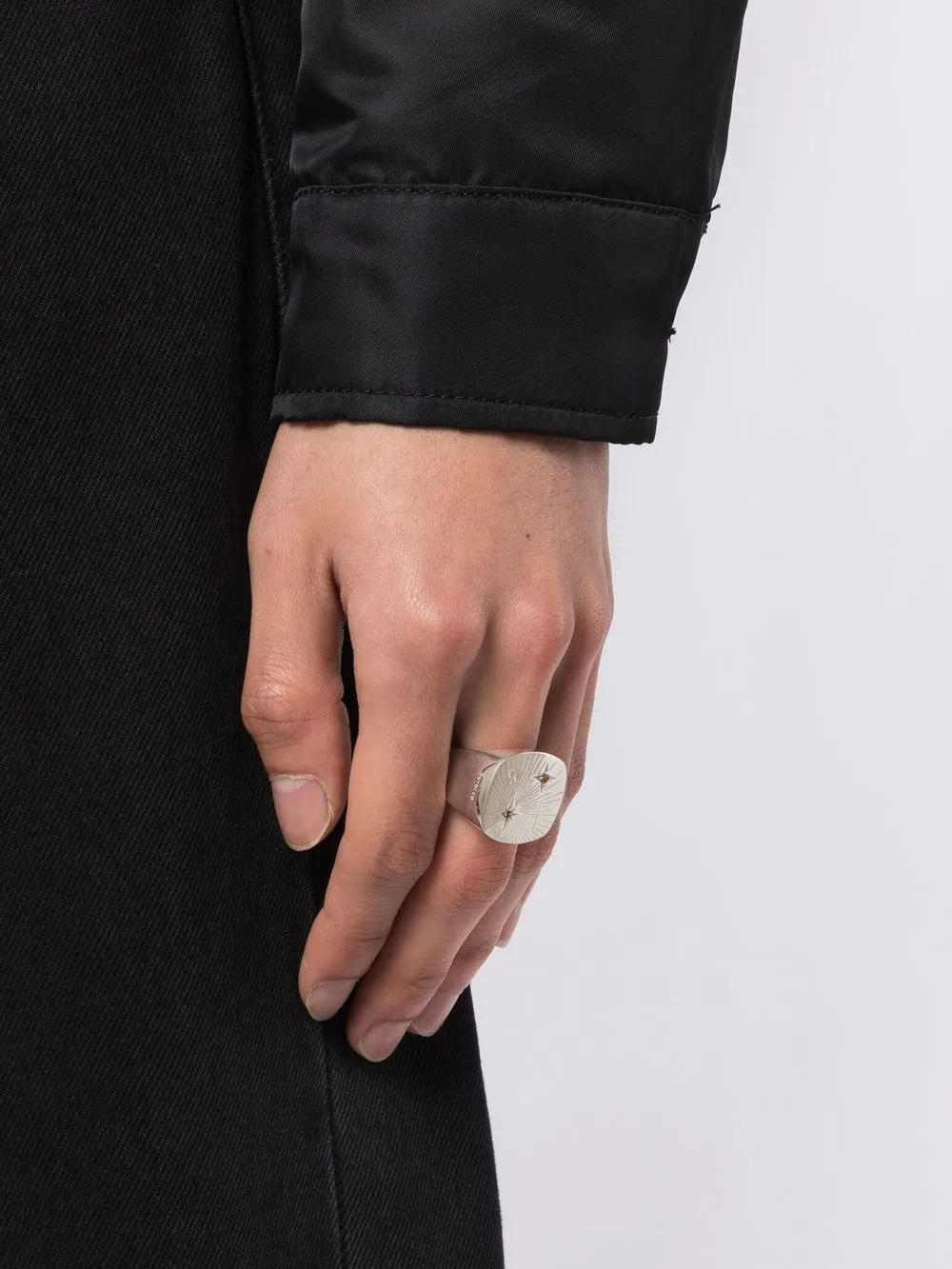 Silberfarben, Sterlingsilber, Kristallverzierung, eingraviertes Logo, Siegelring, ohne Verschluss.