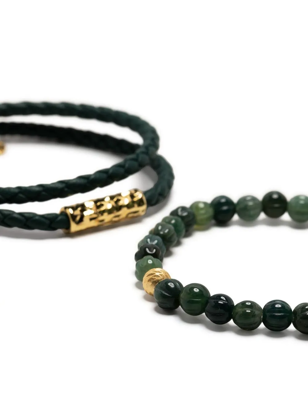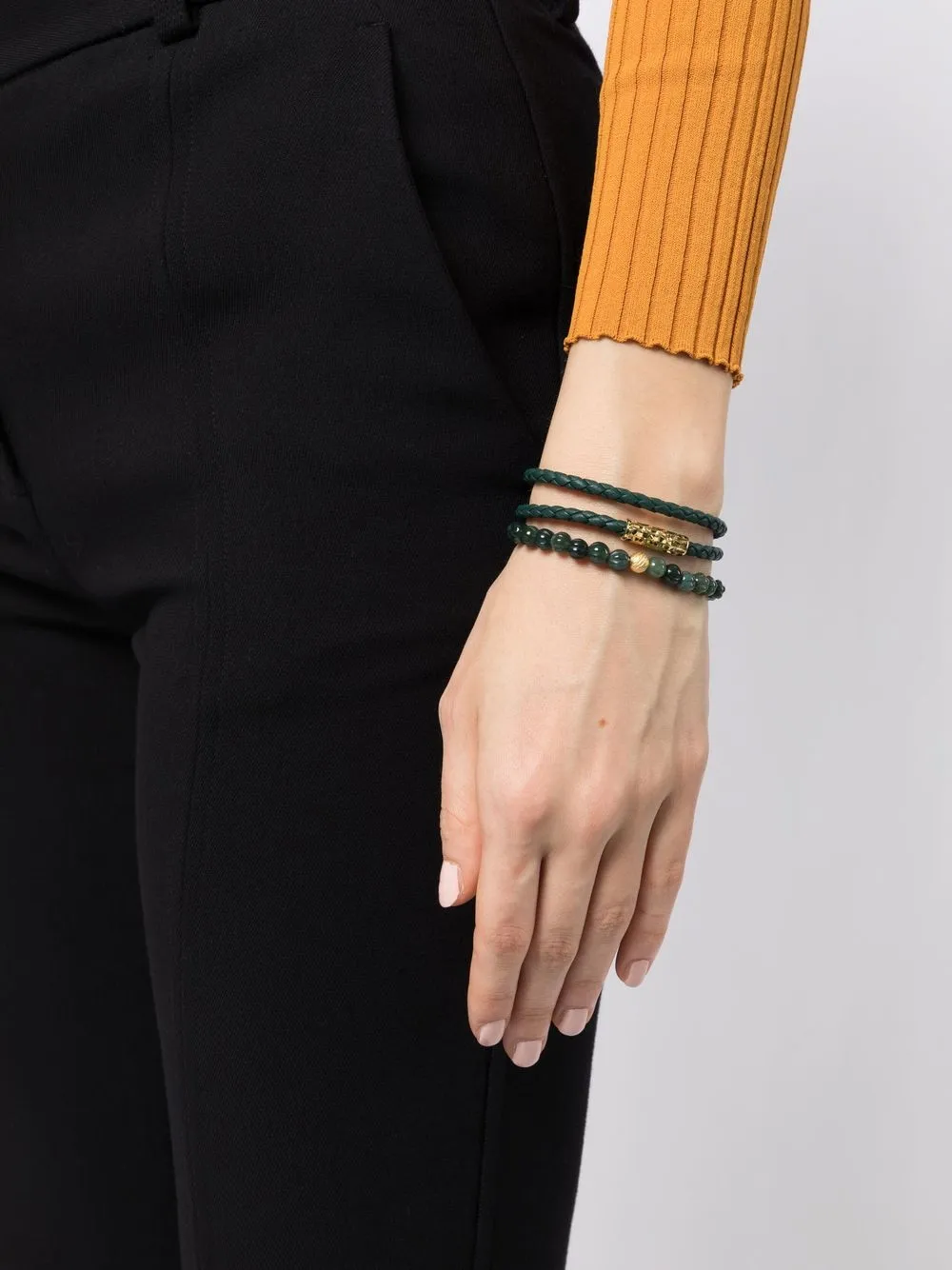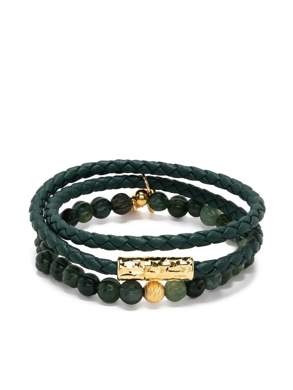 Grün, geflochtener Riemen, mit Schmucksteinen besetzt, goldfarbene Beschläge, gehämmertes Finish.
