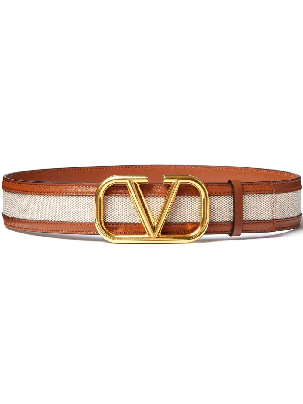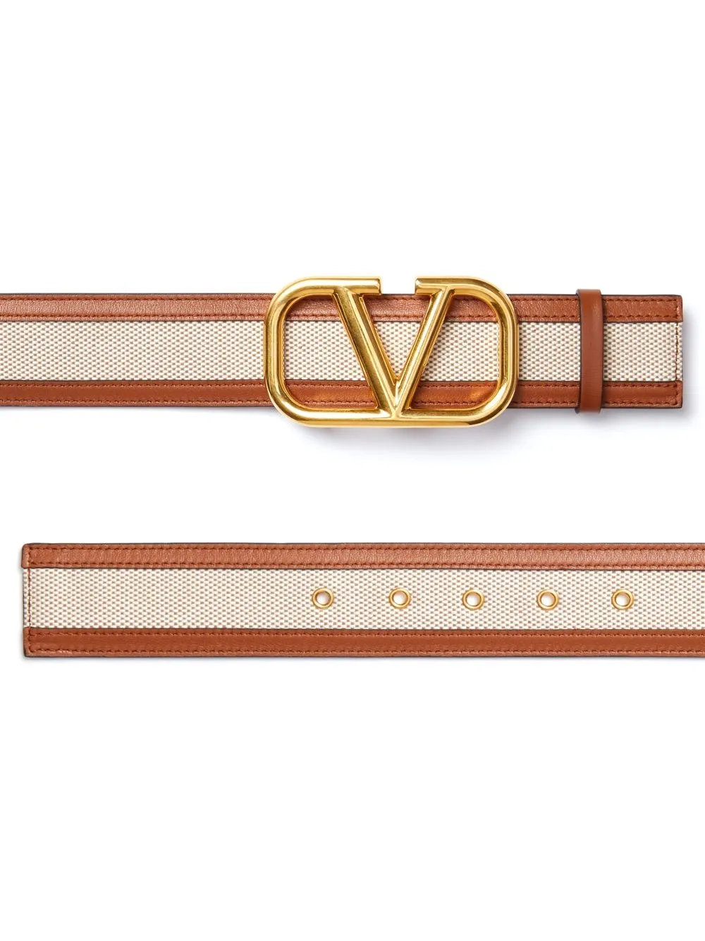 VLogo Signature Gürtel von Valentino Garavani US. Merkmale: Kamelbraun, Beige, Kalbsleder, Canvas, VLog- Detail, goldfarbene Beschläge, Gürtelschlaufen und Lochmuster.