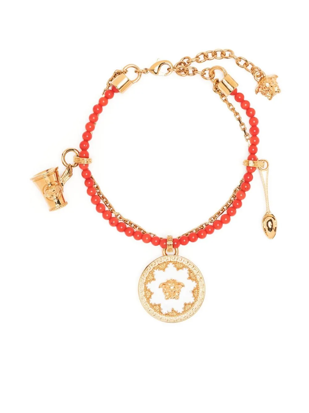 Koralle, Goldfarben, Medusenkopf, Kettenarmband, Perlenkette, Spangenverschluss.