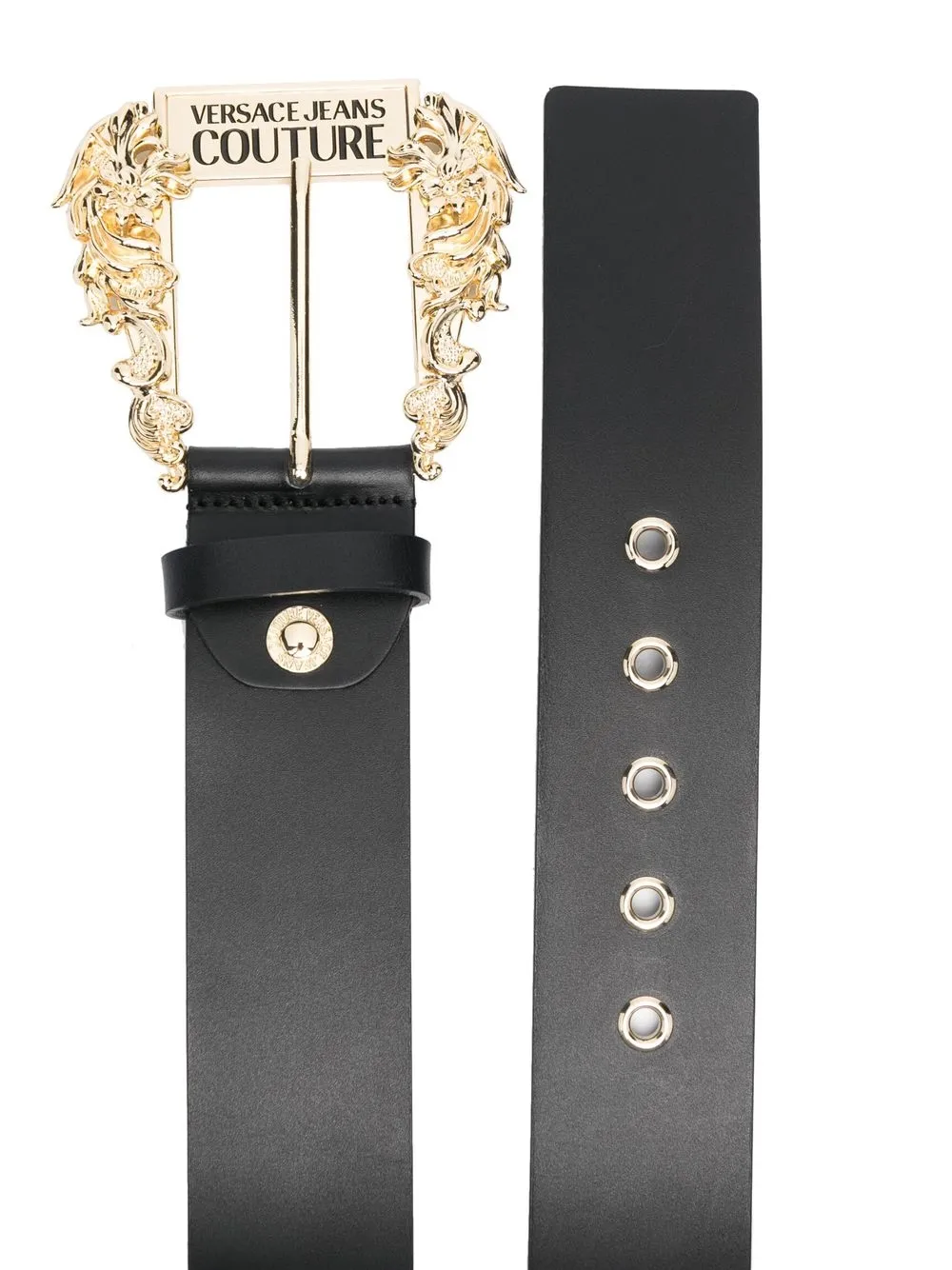 Schwarz, Kalbsleder, goldfarbener Schnallenverschluss, Logo-Schnalle, Metallöse.