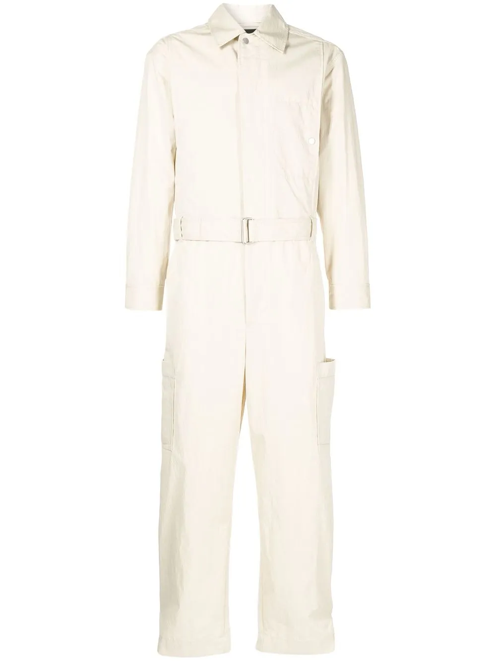 Sandbeige, Baumwollgemisch, verdeckter Verschluss vorne, Brusttasche mit Knopfverschluss, gegurtete Taille, zwei seitliche Eingrifftaschen, zwei aufgesetzte Seitentaschen, gerades Bein.