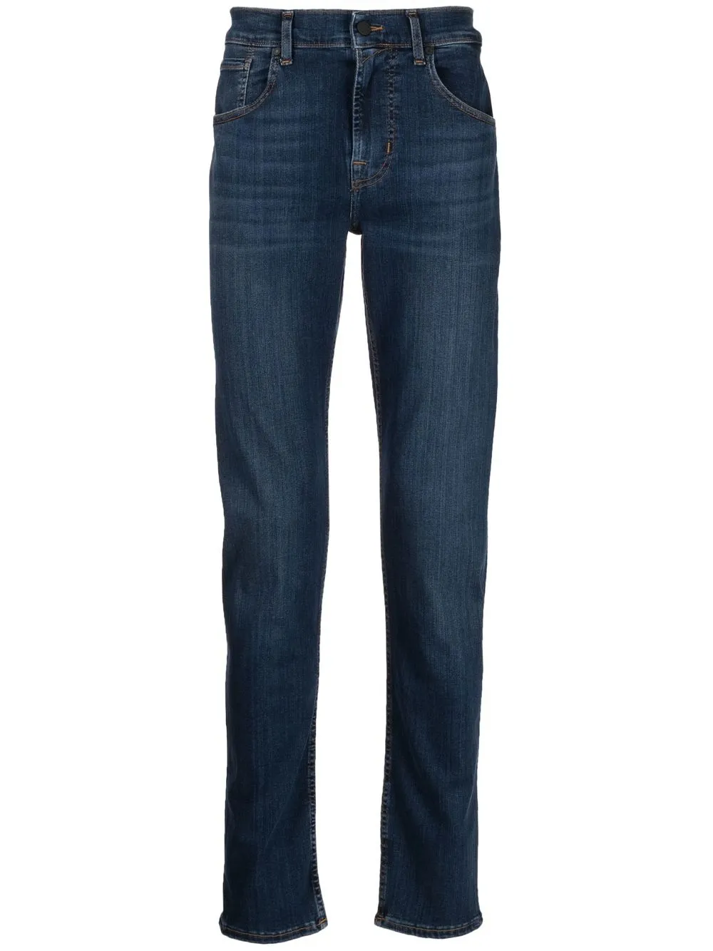 Indigoblau, Baumwollgemisch, tiefe Taille, Gürtelschlaufen, Knopf- und Reißverschluss vorne, Five-Pocket-Design, Tapered-Bein.