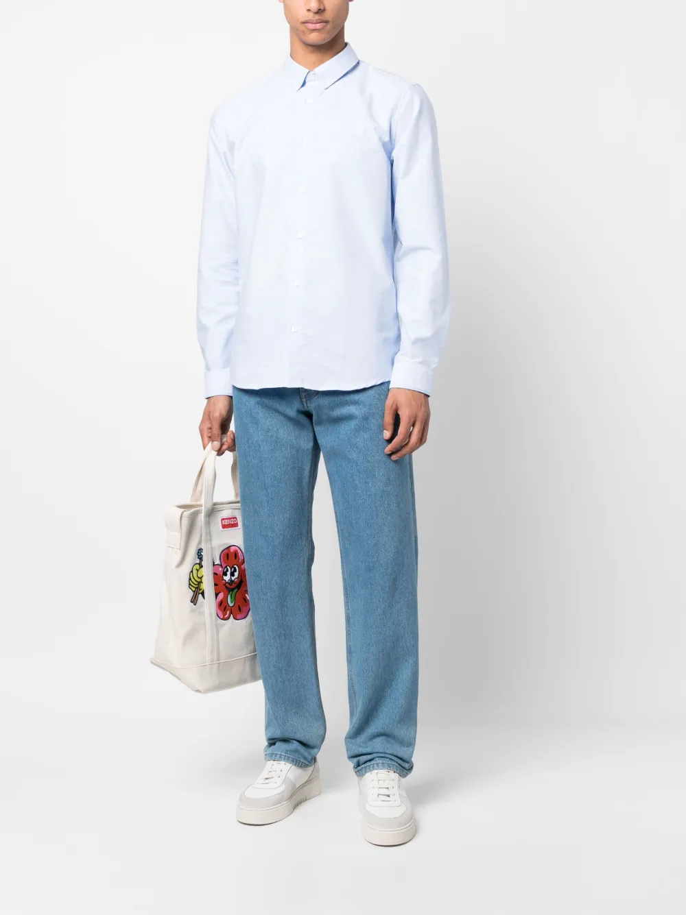 Hellblau, Baumwolle, Logo-Stickerei an der Brust, Button-down-Kragen, Knopfverschluss vorne, lange Ärmel, Knopfmanschetten, abgerundeter Saum.
