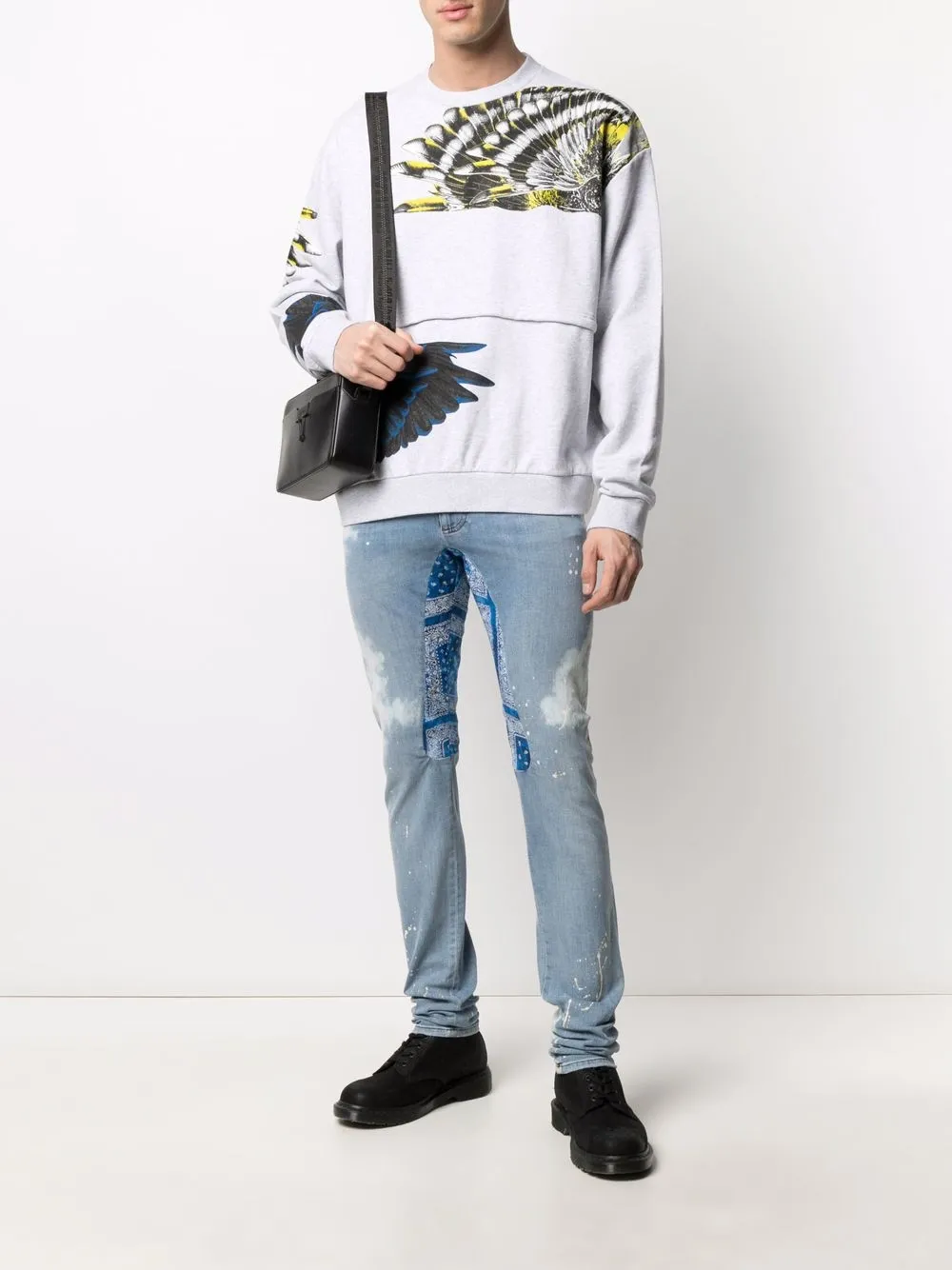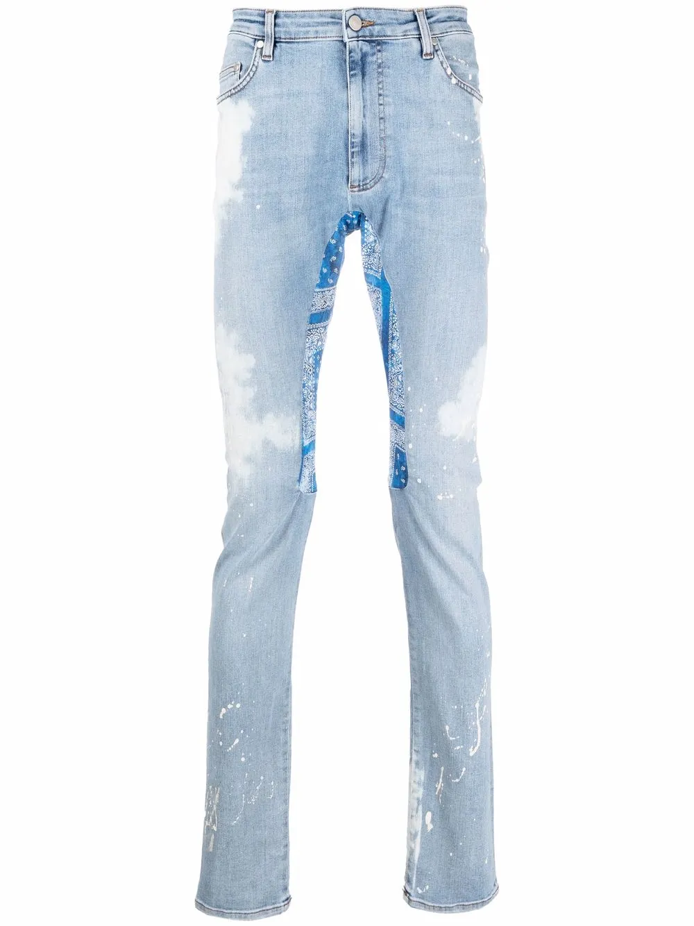 Kontrastfarbiger Einsatz, Distressed-Look, Farbklecks-Print, Knopf- und Reißverschluss vorne, Gürtelschlaufen, zwei Taschen an der Seite, Logo-Patch hinten, zwei aufgesetzte Gesäßtaschen. Farbe: Blau. Material: Baumwolle.