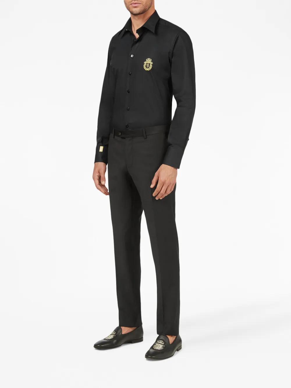 Gordon crest-embroidered poplin shirt from BILLIONAIRE featuring jet black, gold-tone, stretch-cotton, poplin texture, crest motif, classic collar, front button fastening, long sleeves, buttoned-cuff sleeves and curved hem.