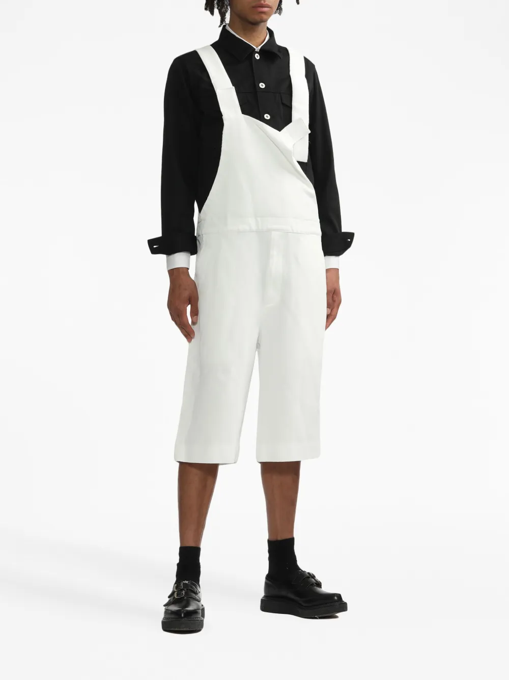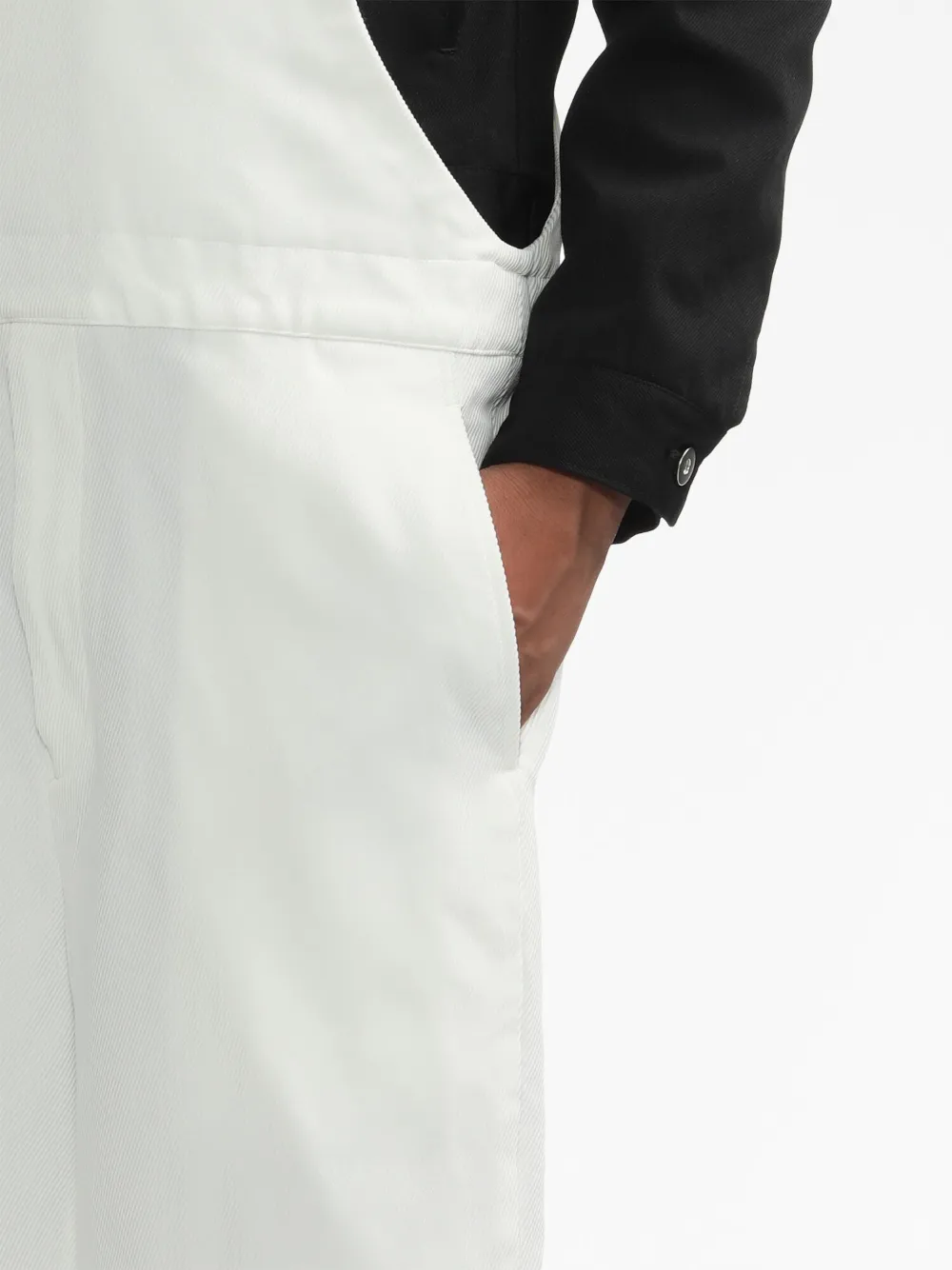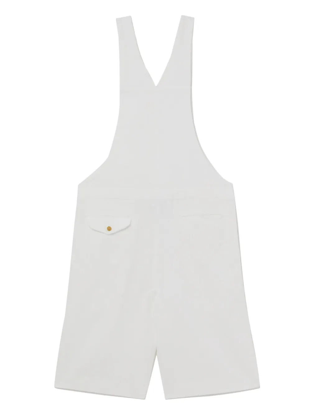 Weiß, Cropped-Design, eckiger Ausschnitt, V-Rückenausschnitt, breite Schulterriemen, Klettverschluss vorne, zwei Eingrifftaschen an der Seite, eingefasste Gesäßtasche, Klappentasche hinten. Dieser Unisex-Artikel wird in Herrengrößen angezeigt.