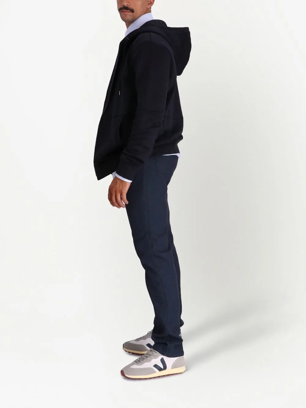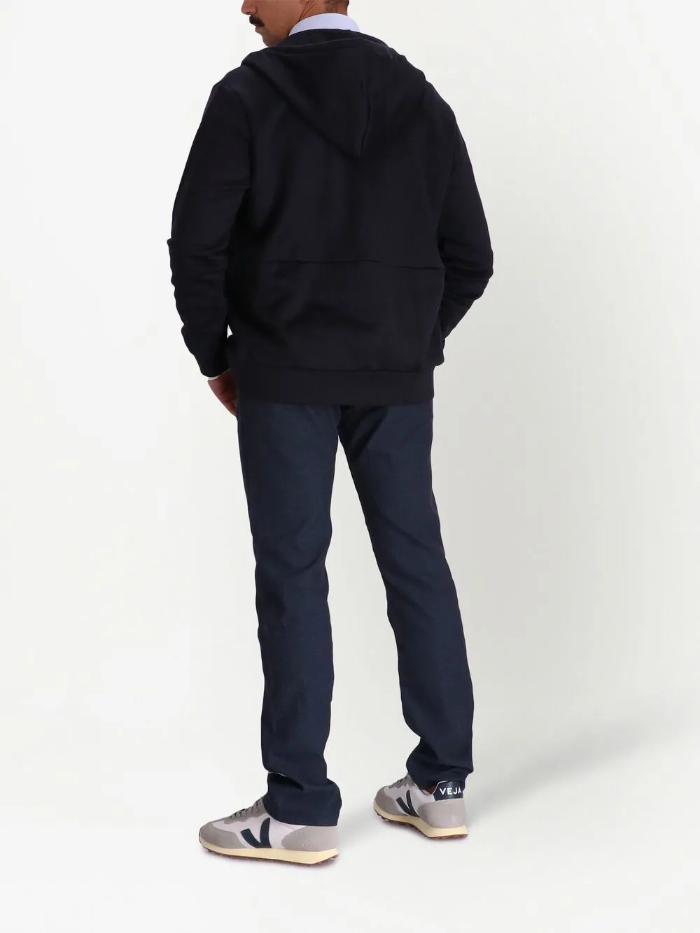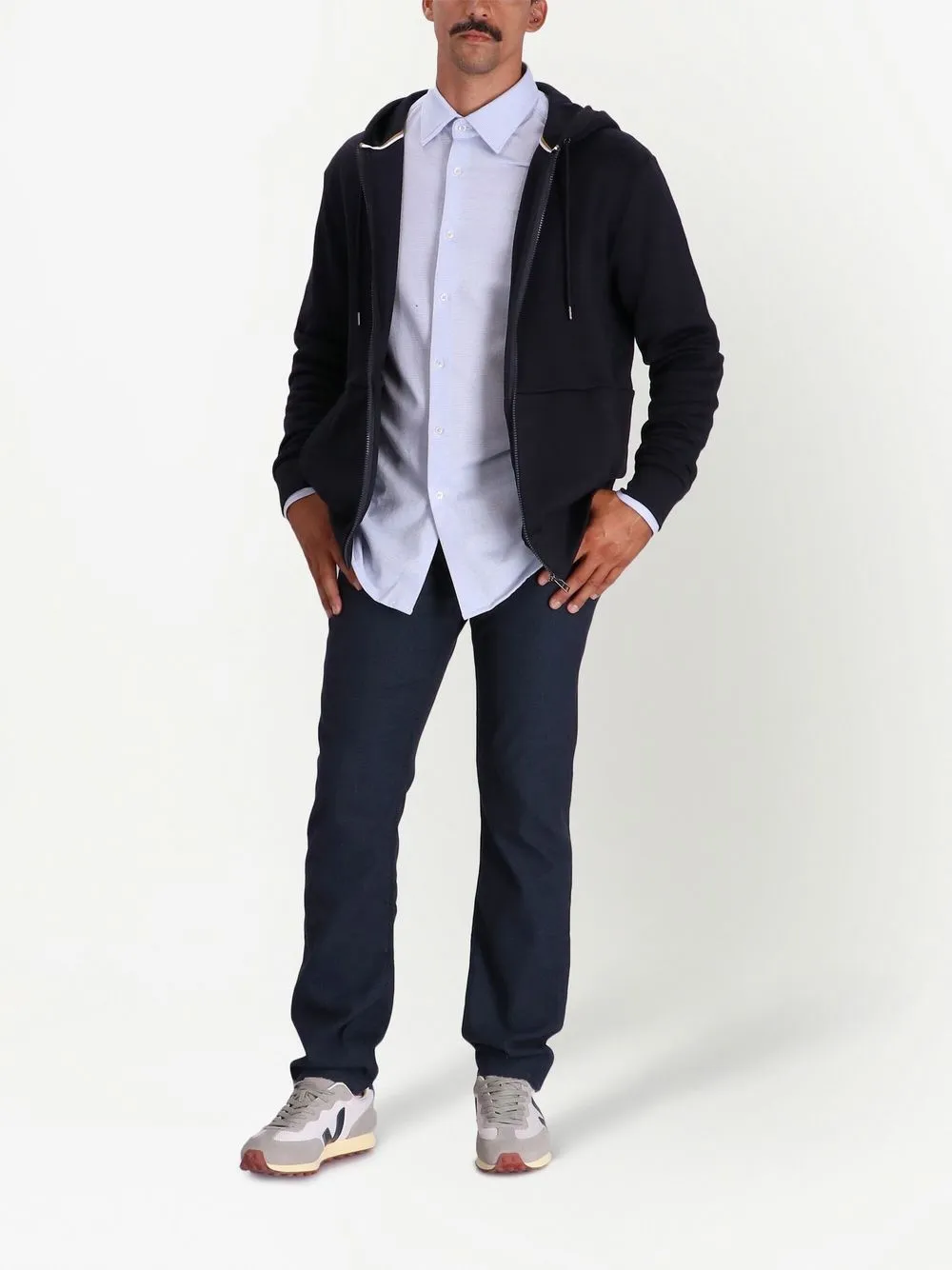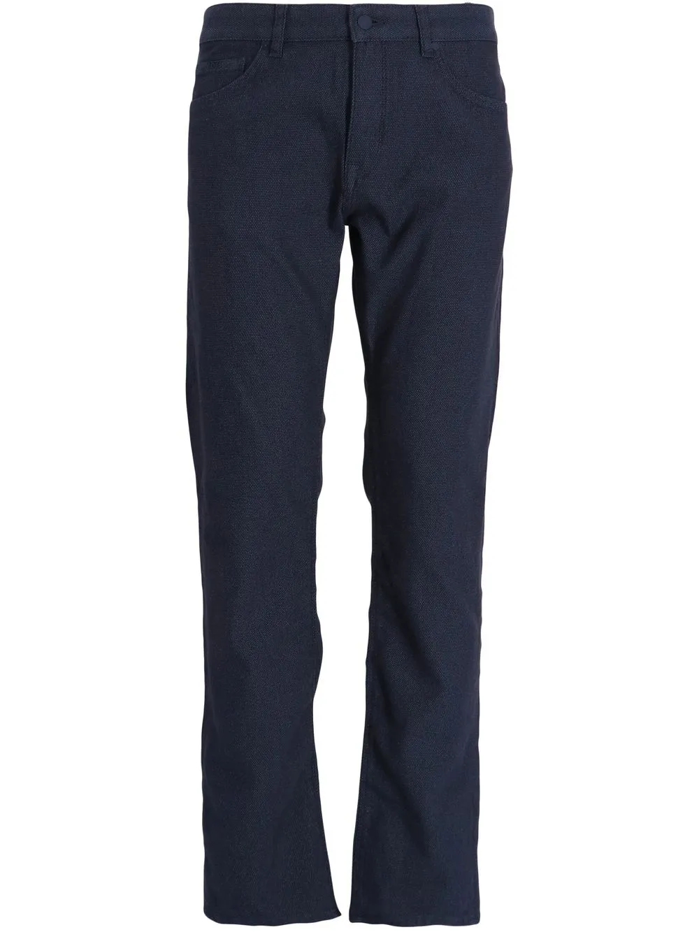 Dunkelblau, Baumwollgemisch, tiefe Taille, zwei Eingrifftaschen an der Seite, gerades Bein.