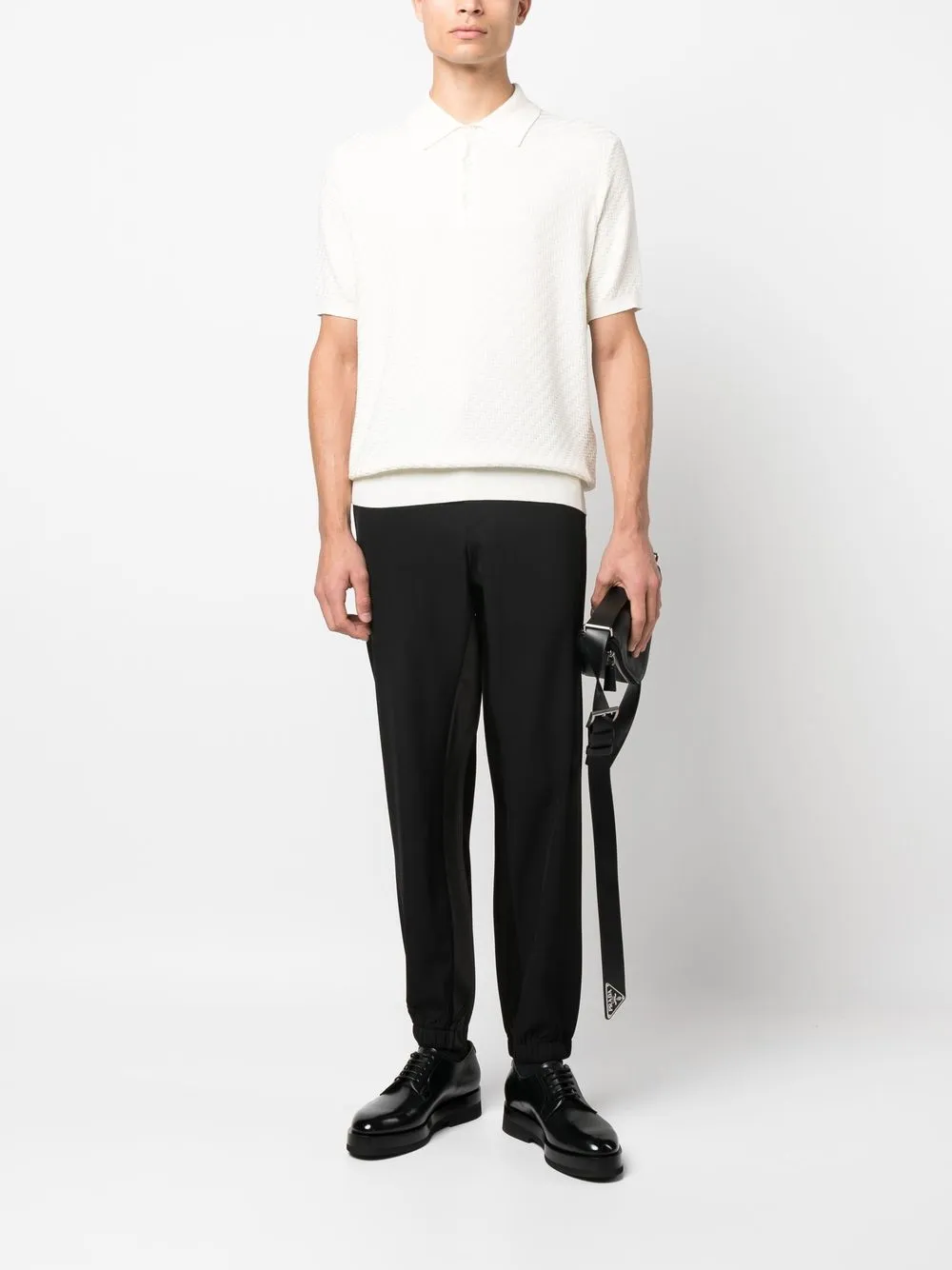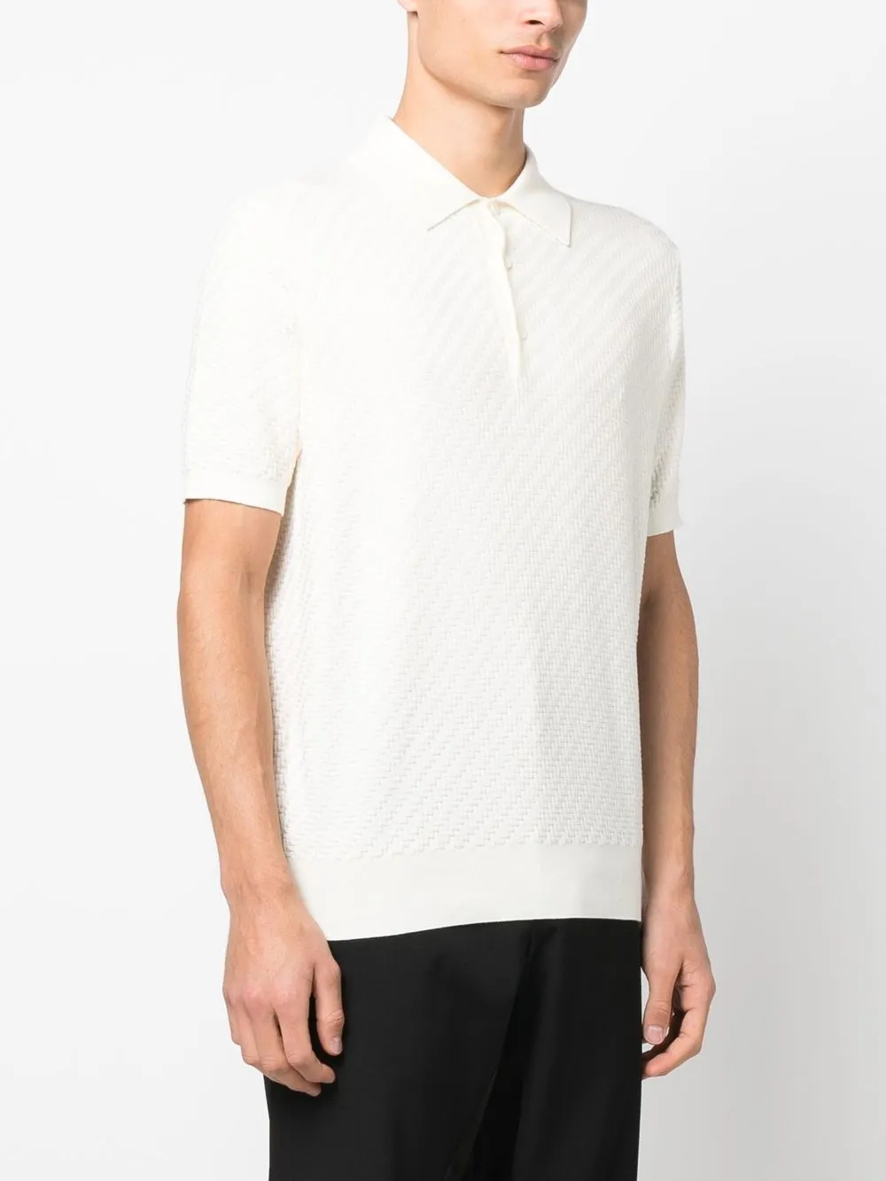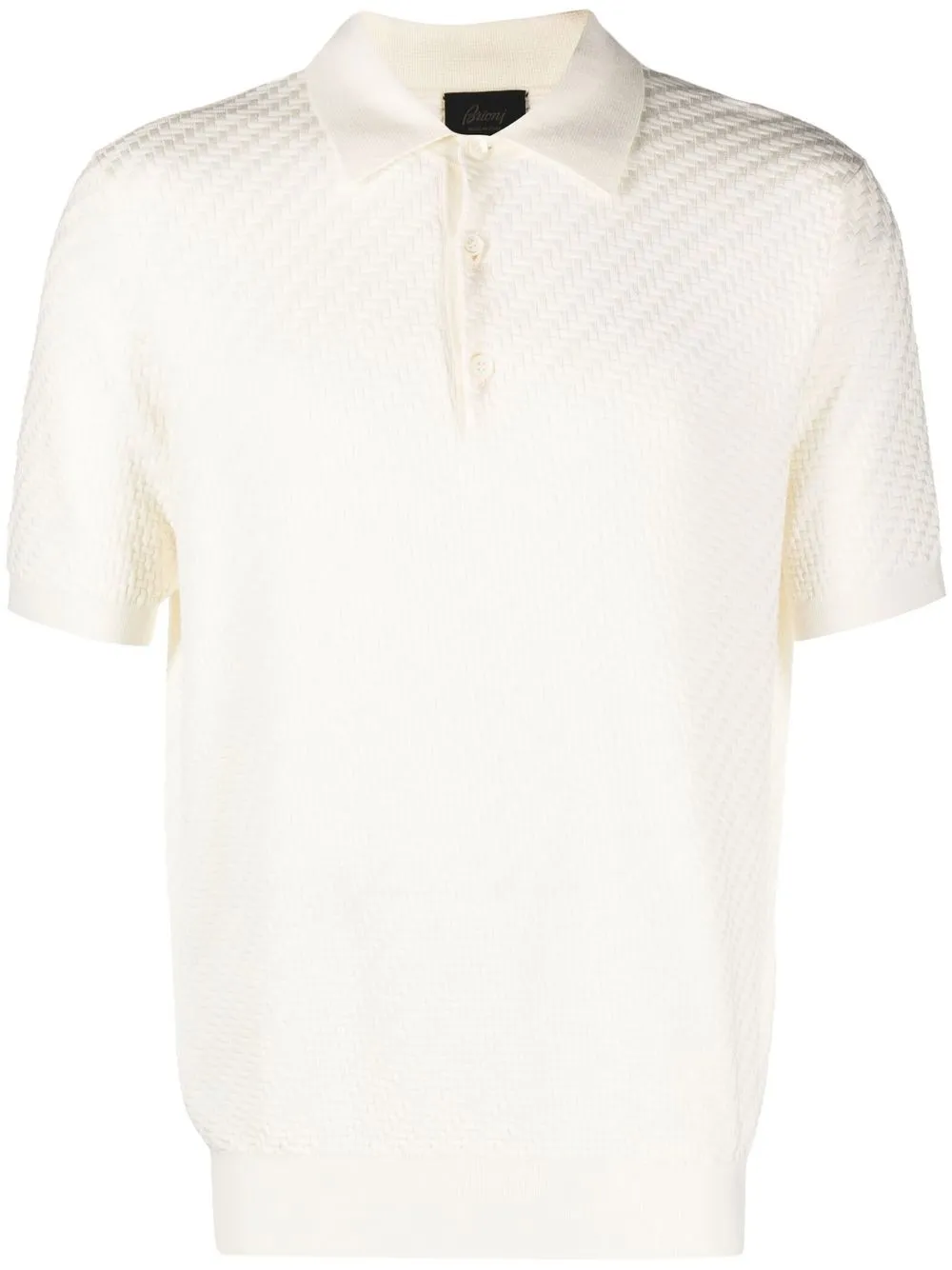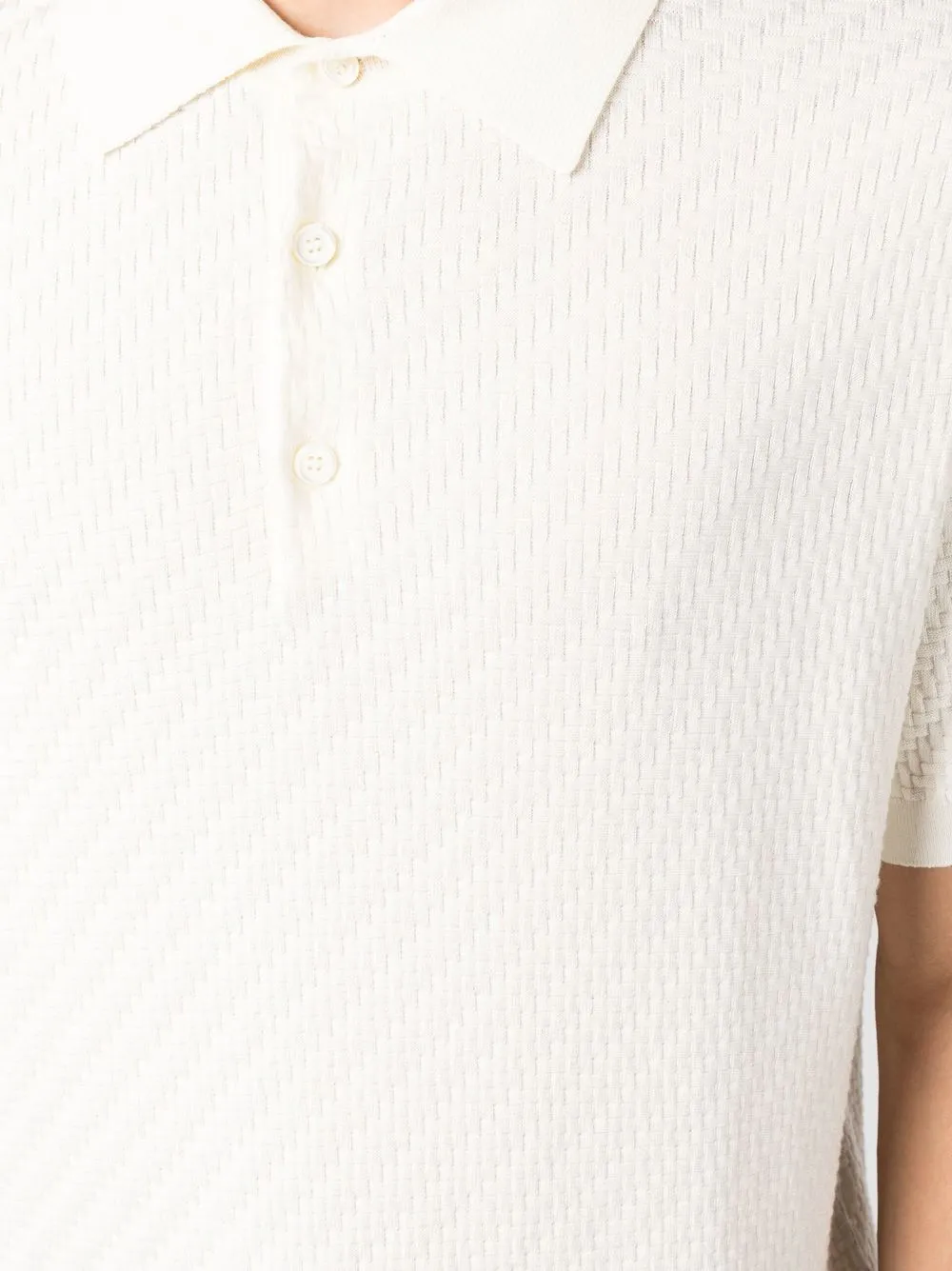 Gestricktes Design, Knopfverschluss vorne, Poloshirtkragen, kurze Ärmel, gerippter Saum.