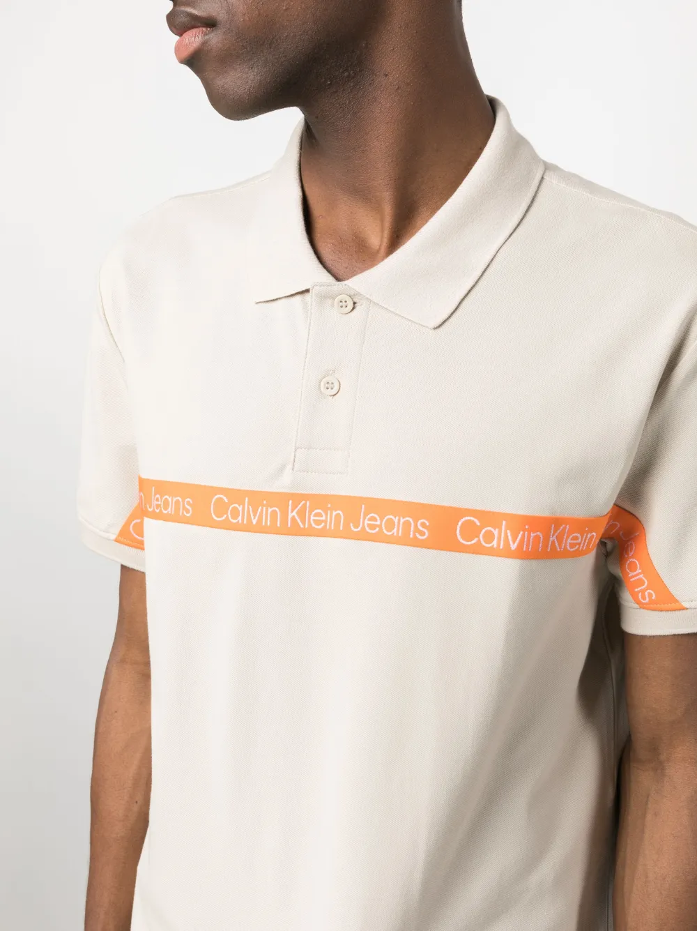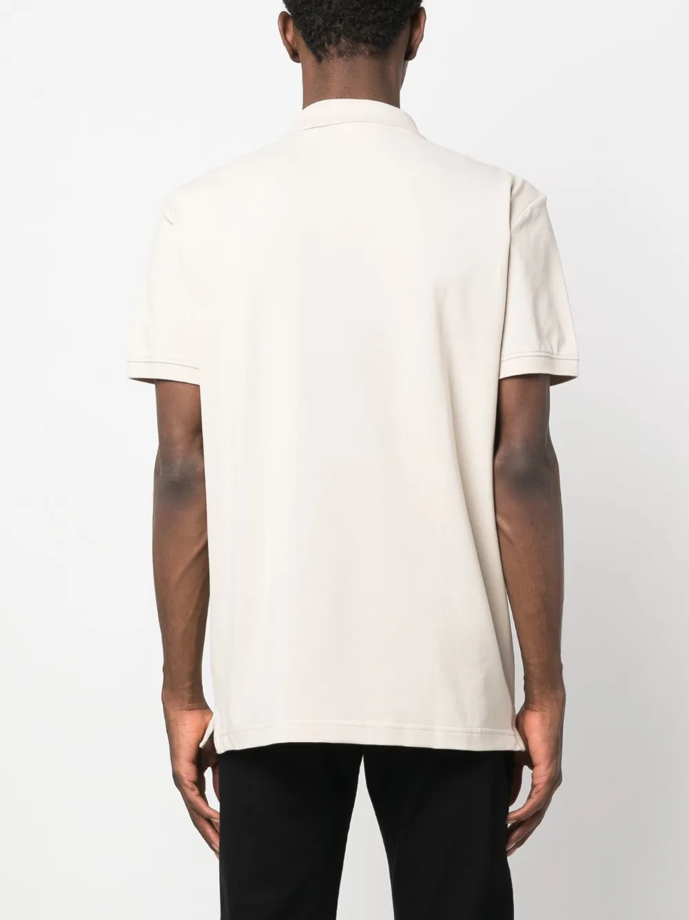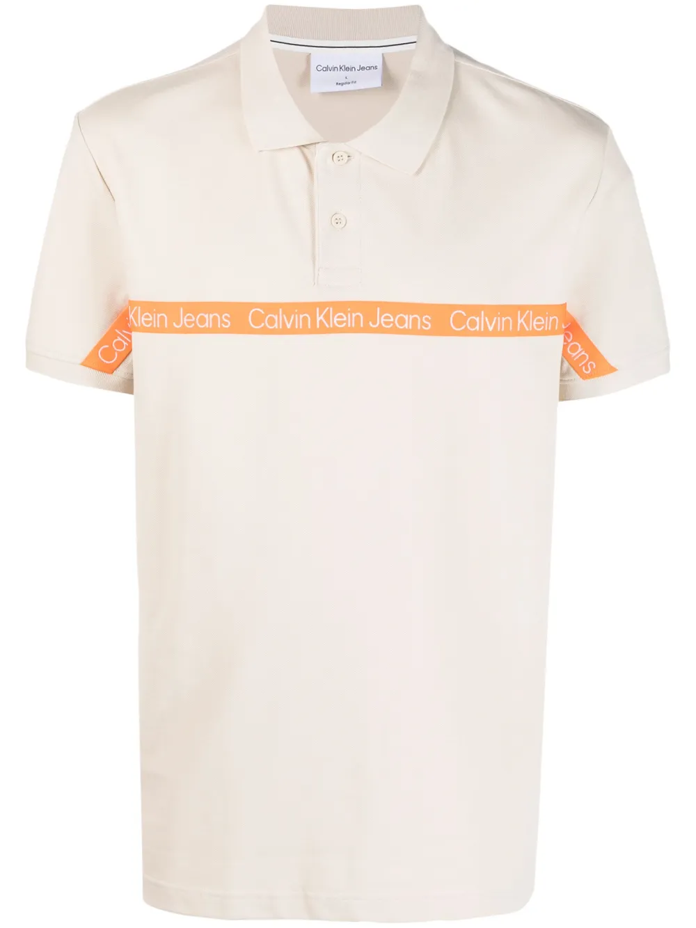 Mandelbeige, Logo-Besatz, Poloshirtkragen, kurze Knopfleiste vorne, kurze Ärmel, gerader Saum.