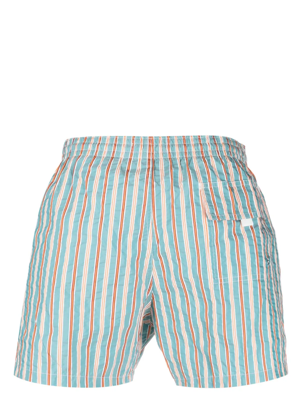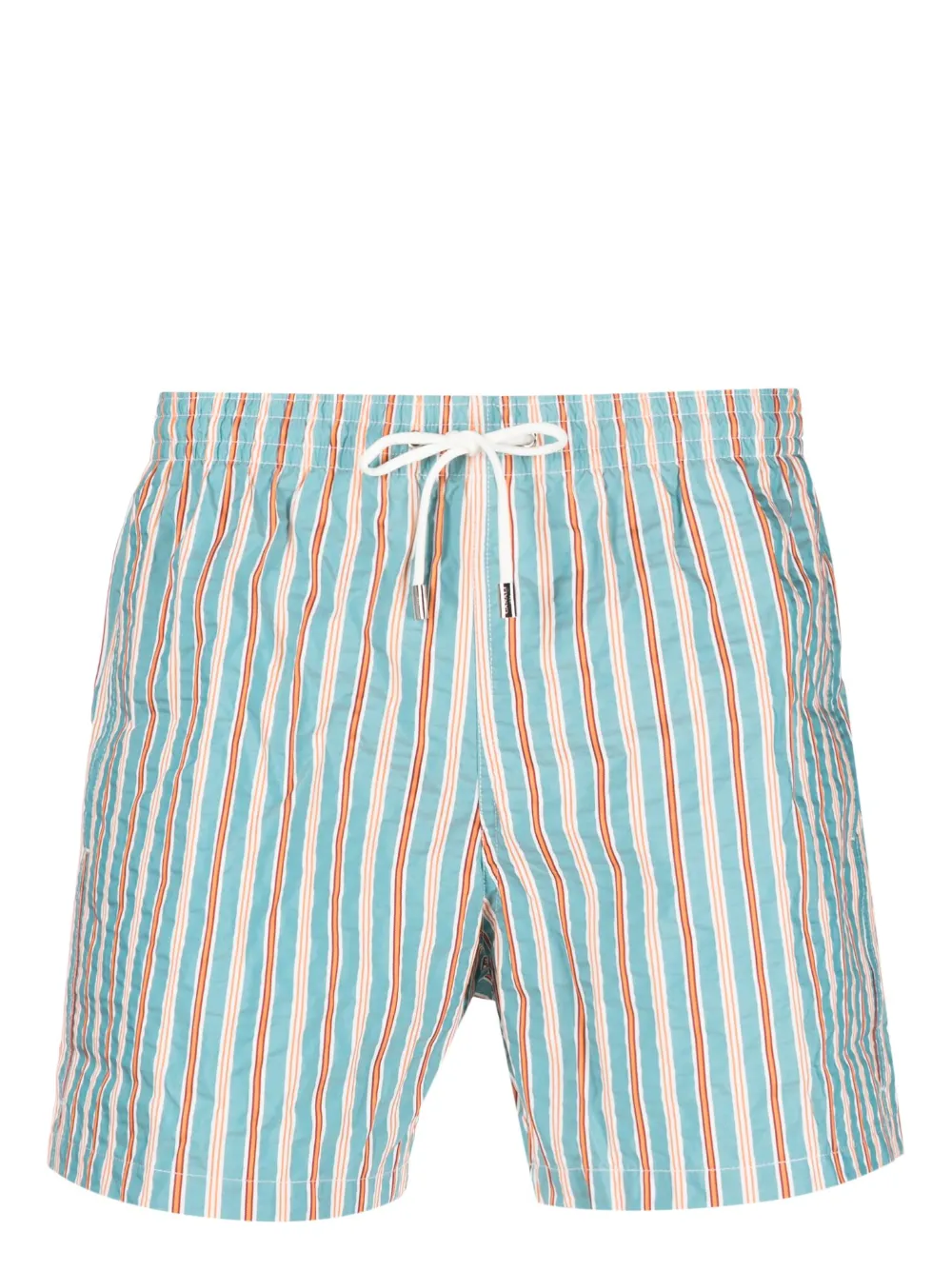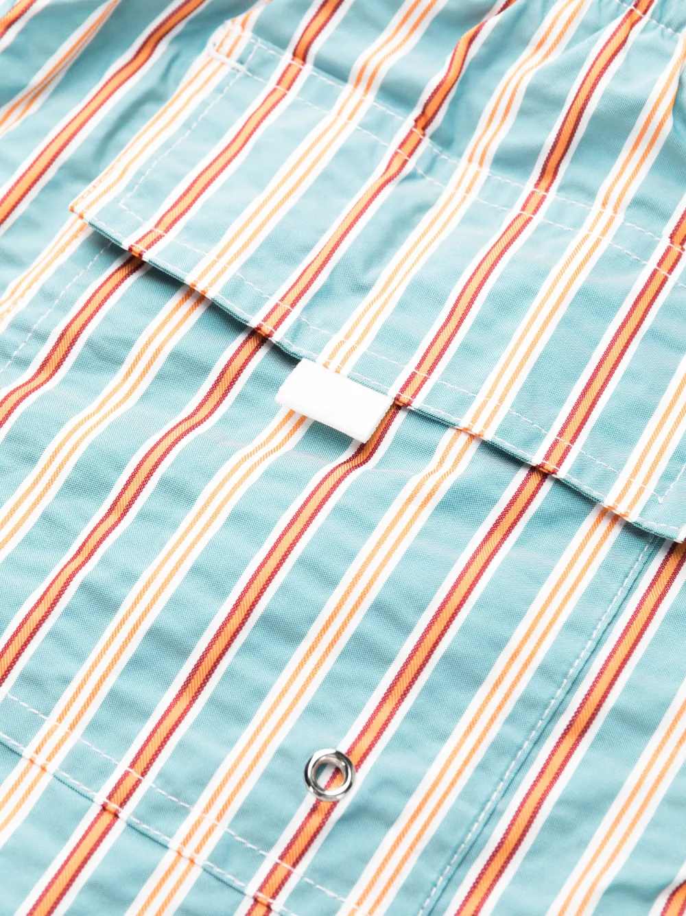 Türkis Blau-Grün, Burnt Orange, Cloud-Weiß, Längsstreifen, silberfarbene Beschläge, gerader Saum, Klappentasche hinten.