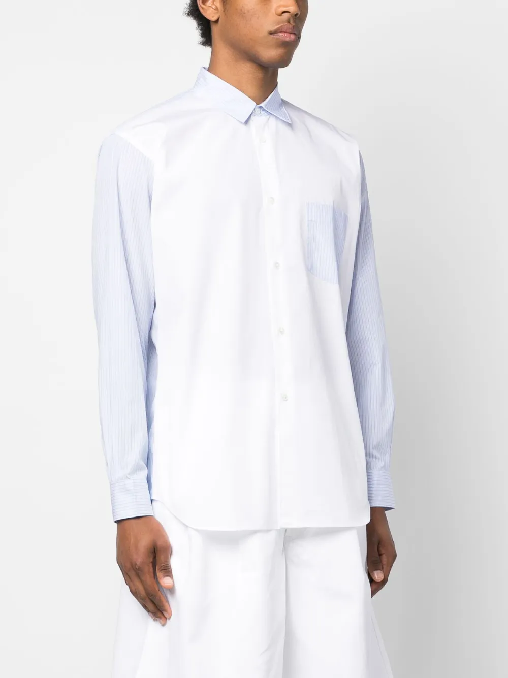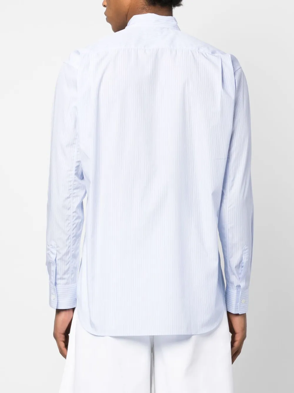 Weiß, Hellblau, Baumwolle, Streifendetails, klassischer Kragen, Knopfverschluss vorne, aufgesetzte Brusttasche, lange Ärmel, abgerundeter Saum.