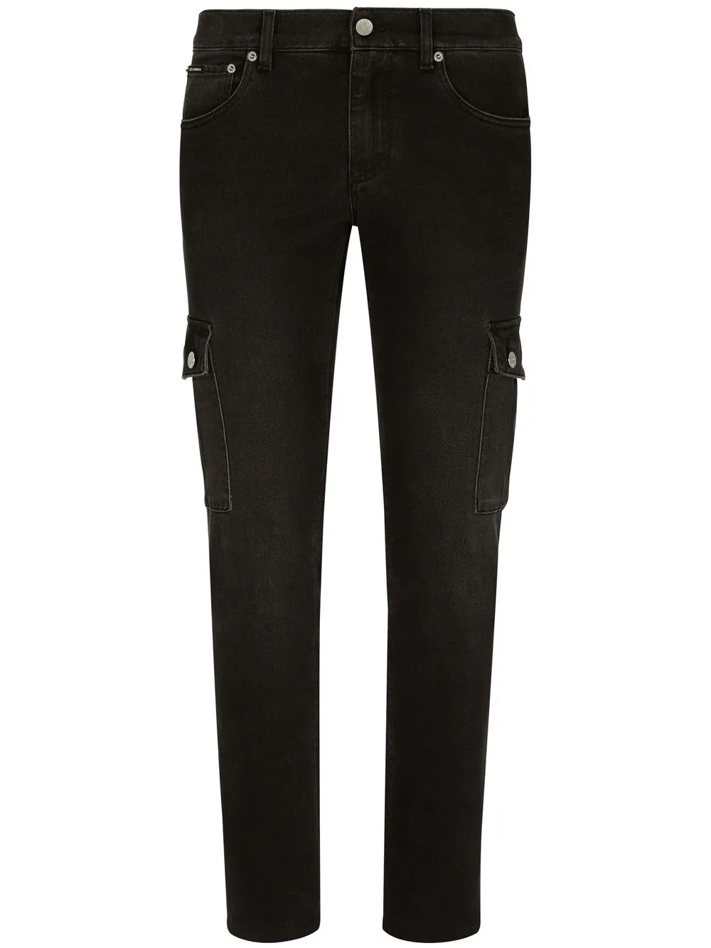 Mittlere Taille, Denim, Gürtelschlaufen, Knopf- und Reißverschluss vorne, Five-Pocket-Design, zwei Cargotaschen an der Seite, gerades Bein.