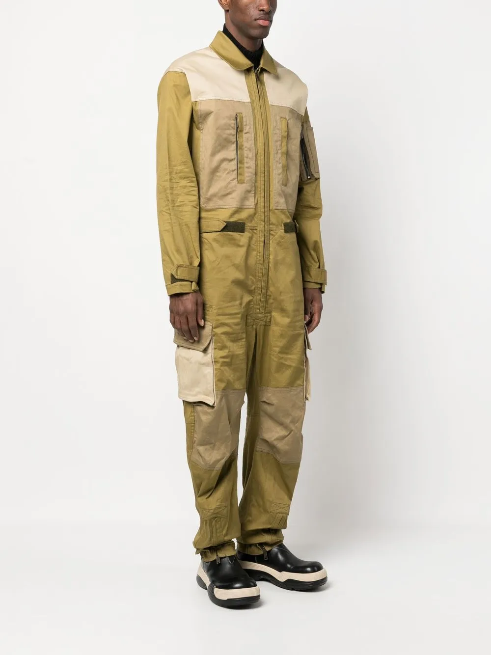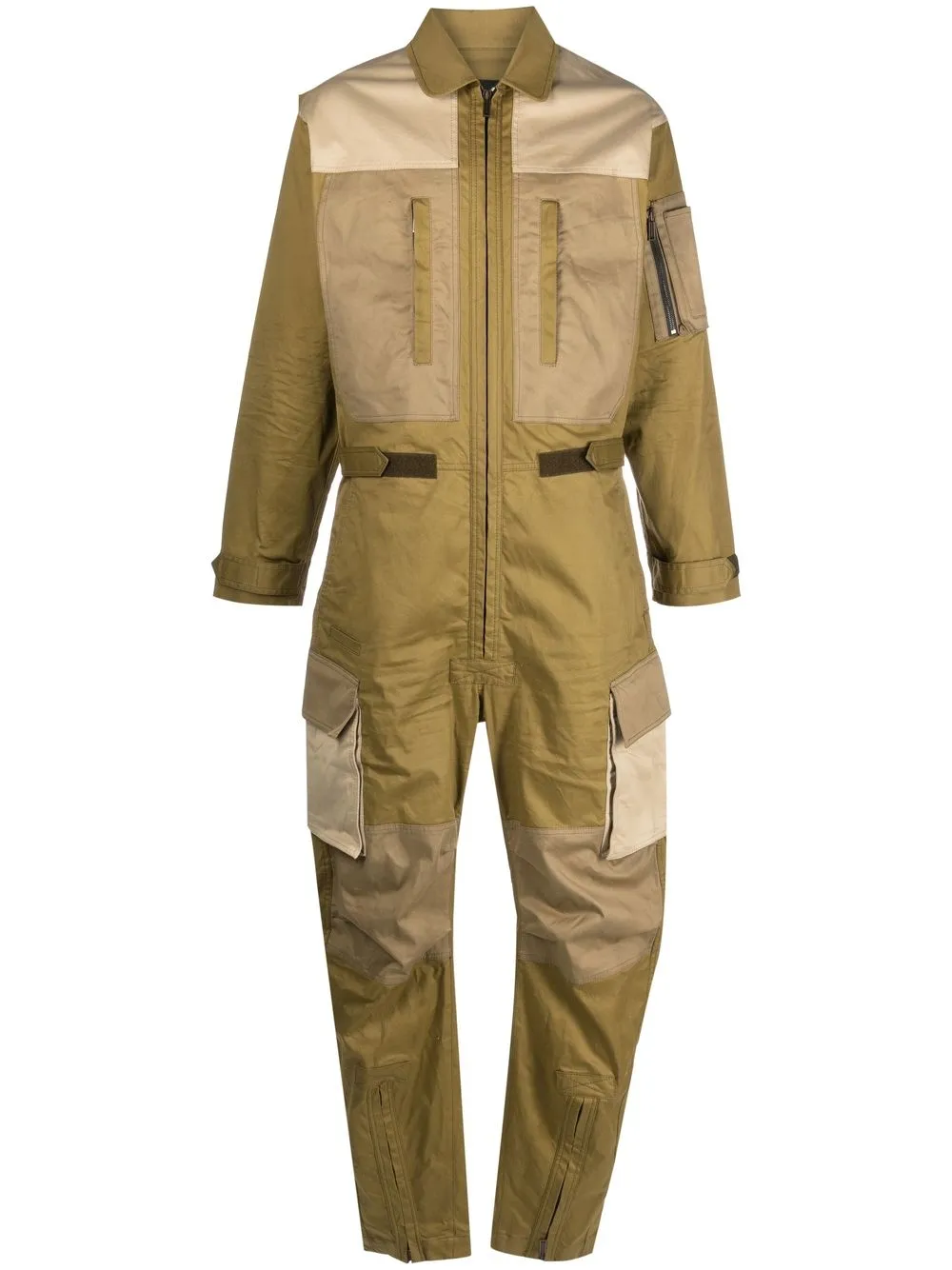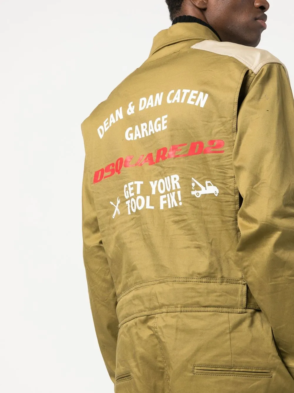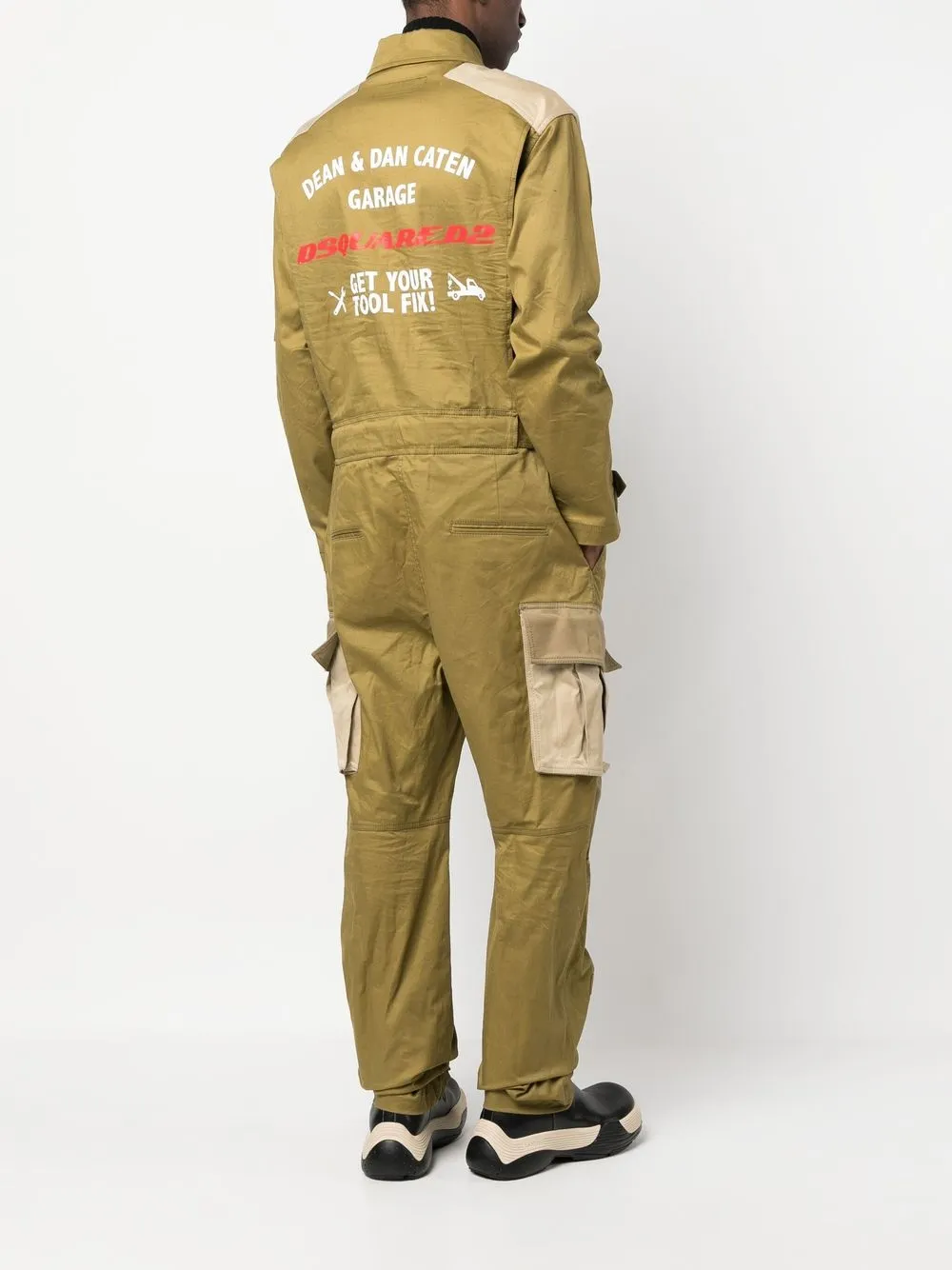 logo-print jumpsuit from DSQUARED2 featuring green, stretch-cotton, logo print to the rear, classic collar, front zip fastening, front zip fastening pockets, two front flap pockets, two rear welt pockets, long sleeves and sleeve zip pocket.
