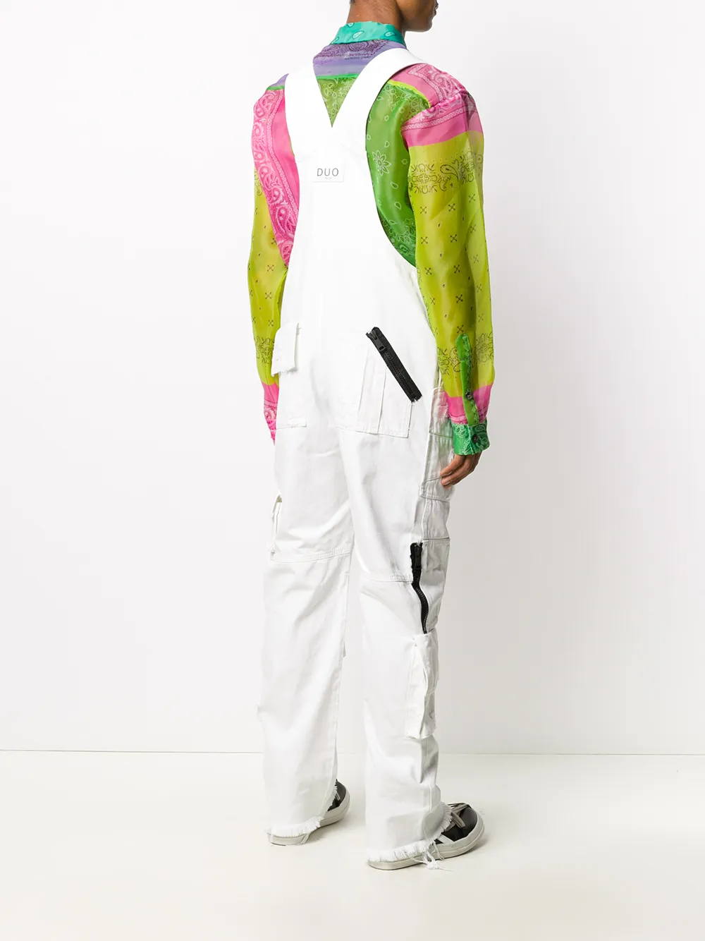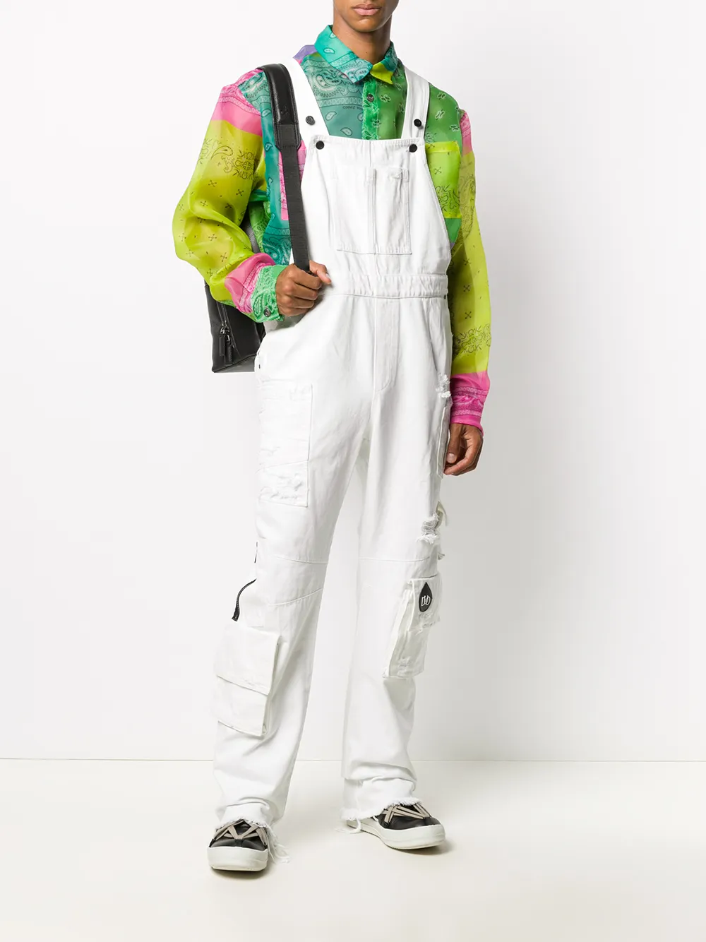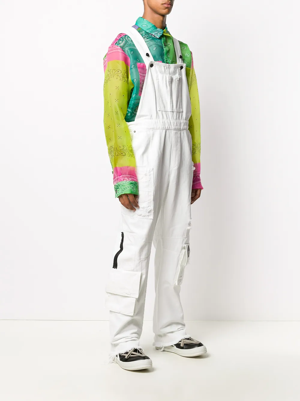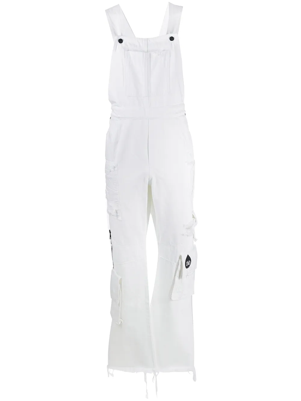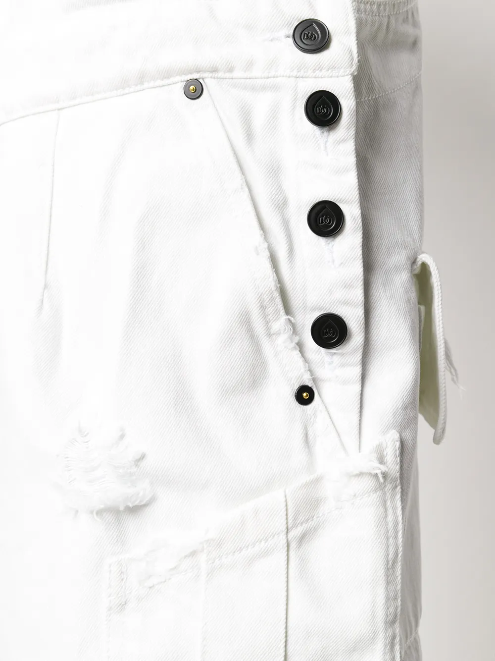 Distressed-Look, ausgefranster Saum, eckiger Ausschnitt, aufgesetzte Brusttasche, Knopfverschluss an der Seite, gerades Bein. Farbe: Weiß.