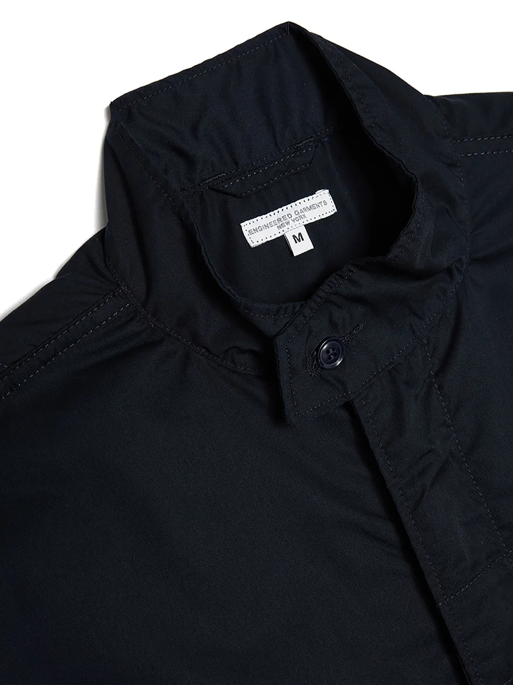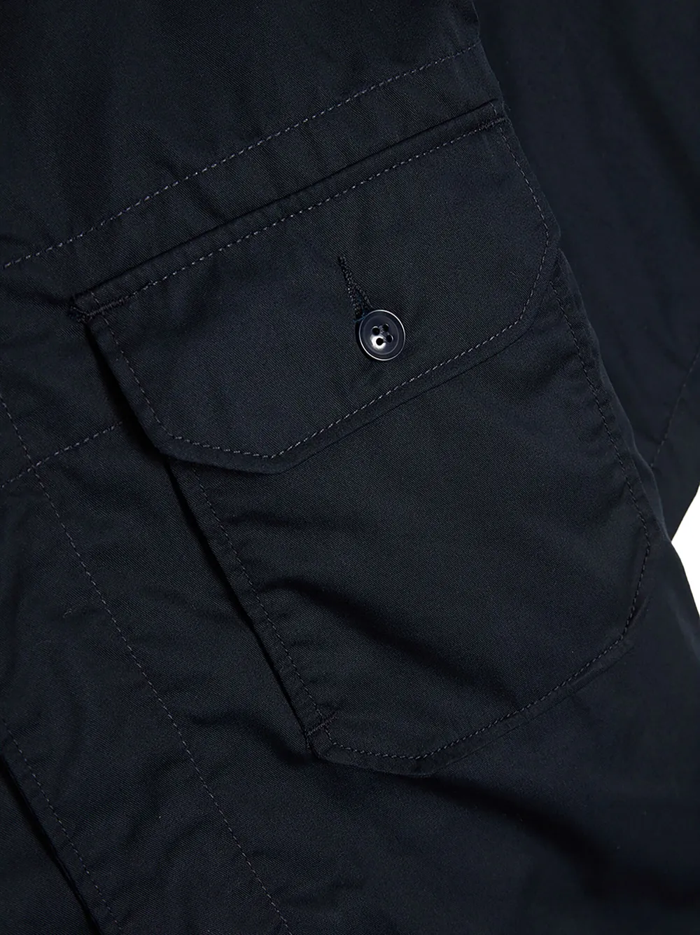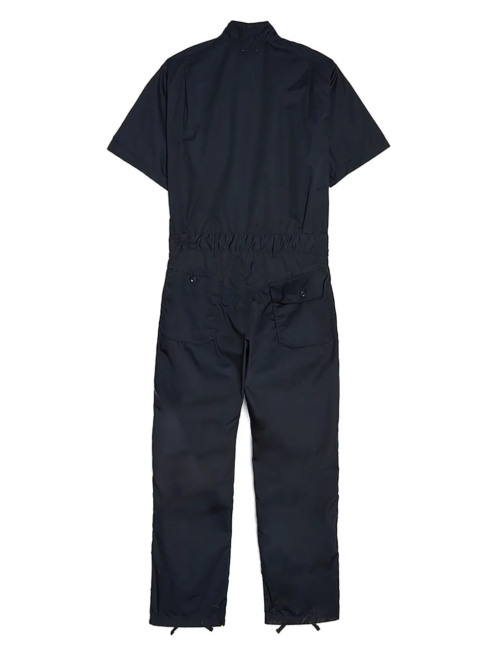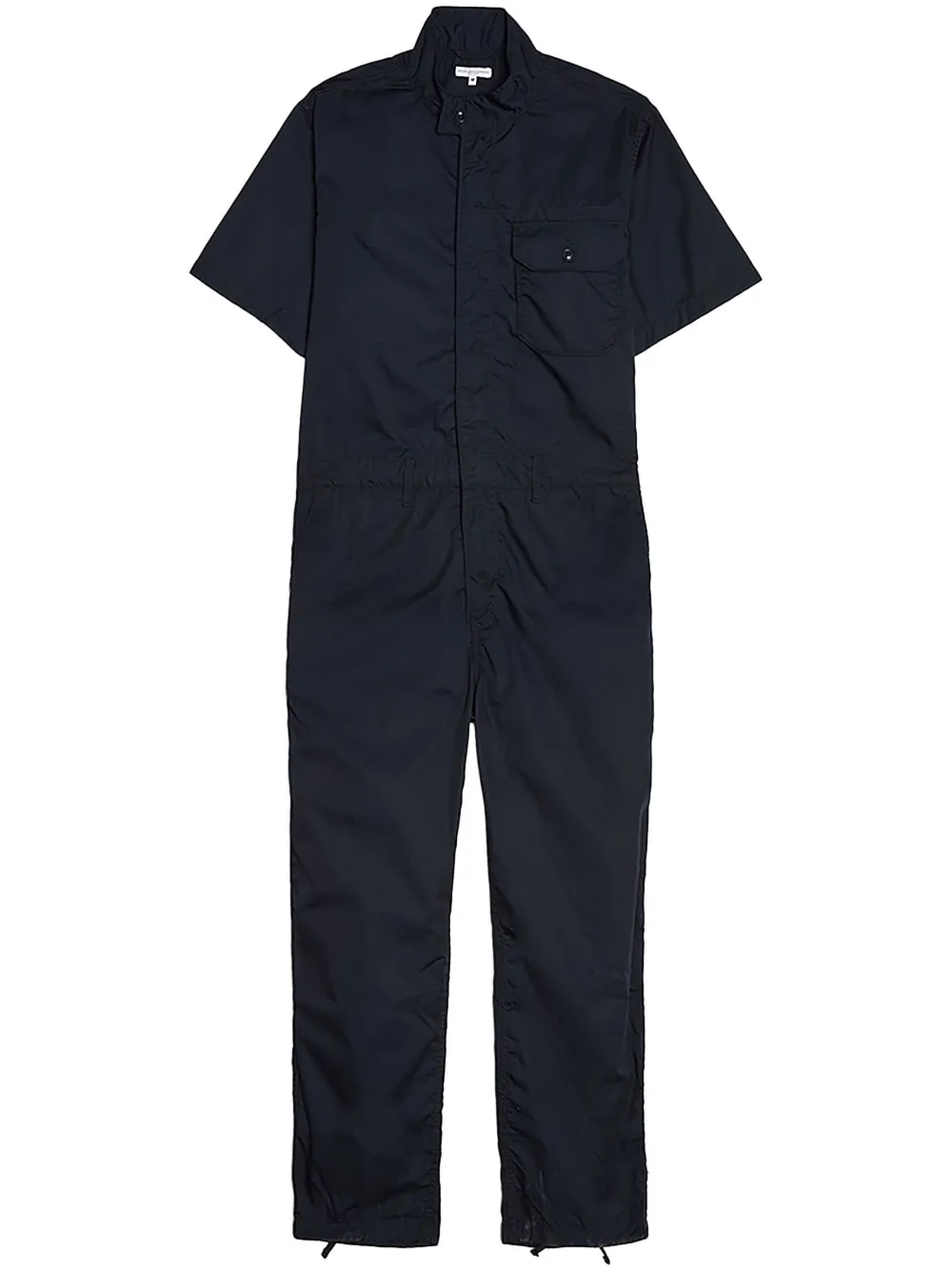 Marineblau, Stehkragen, verdeckter Verschluss vorne, kurze Ärmel, elastischer Bund, aufgesetzte Brusttasche, Klappentasche hinten, aufgesetzte Gesäßtasche, Gürtelschlaufen, gerades Bein.
