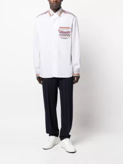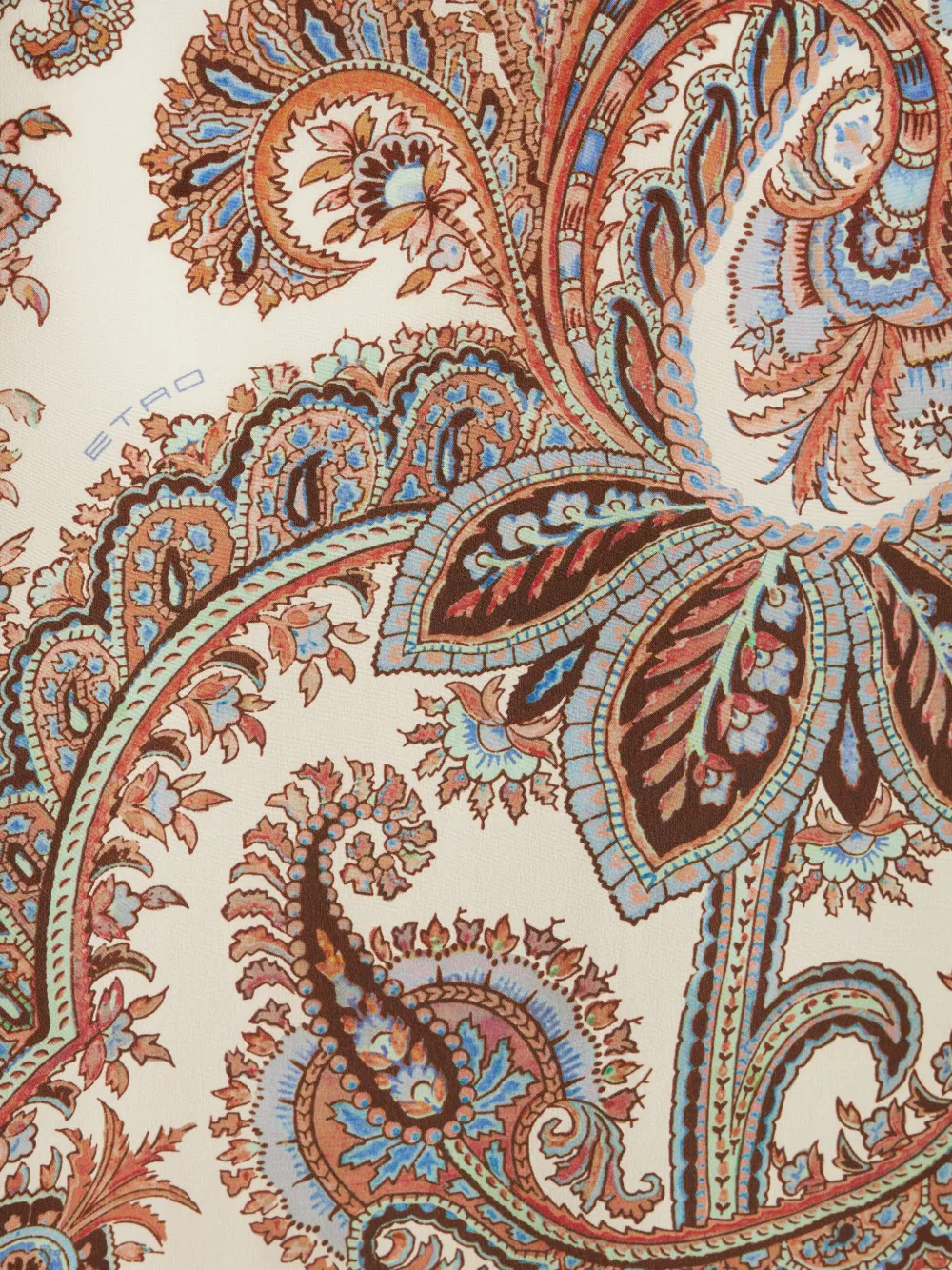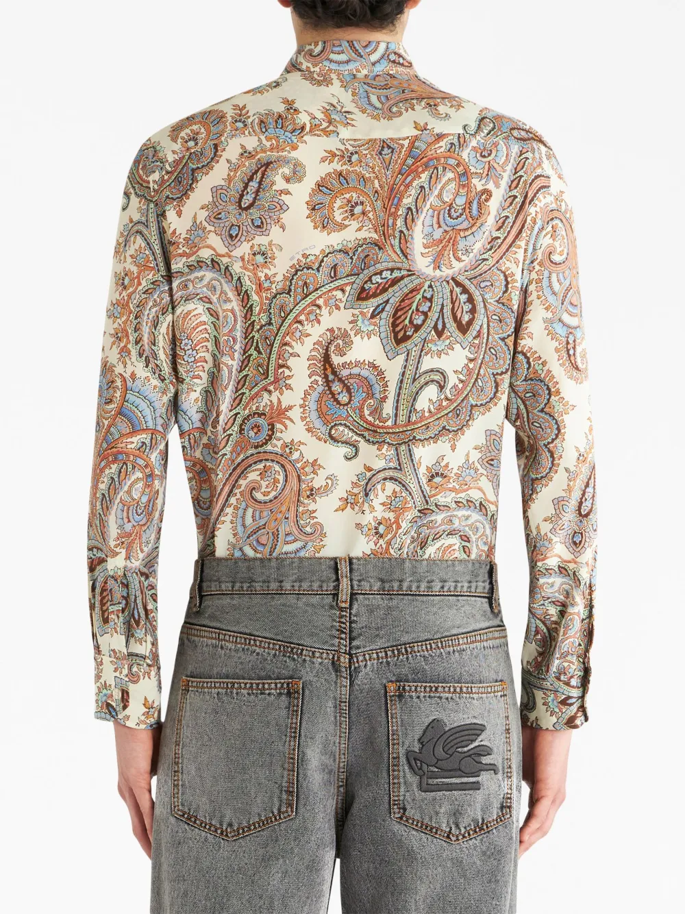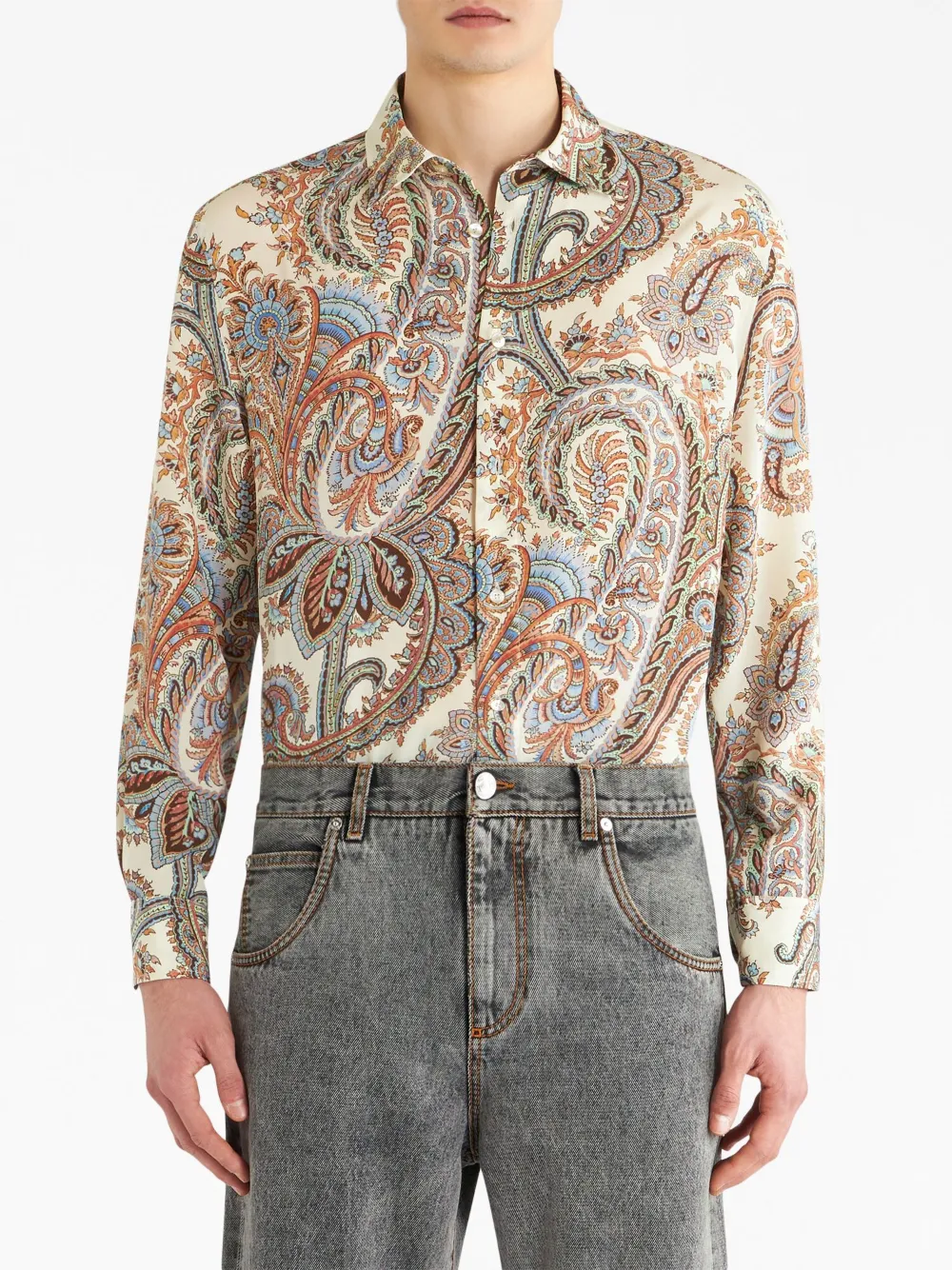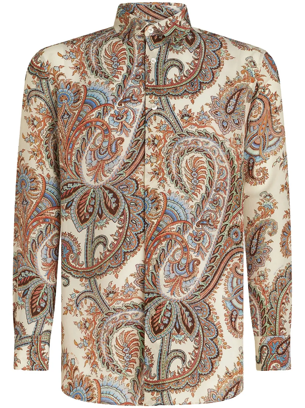 Elfenbeinfarben, Mehrfarbig, Baumwolle, Paisley-Print, klassischer Kragen, Knopfverschluss vorne, lange Ärmel, Ärmel mit Knopfmanschetten, gerader Saum.