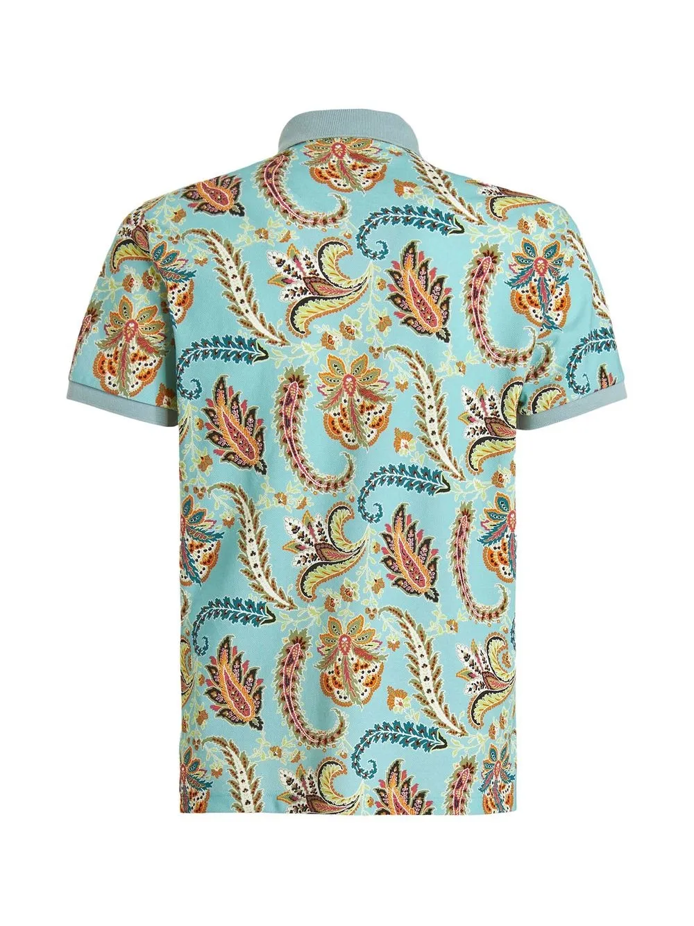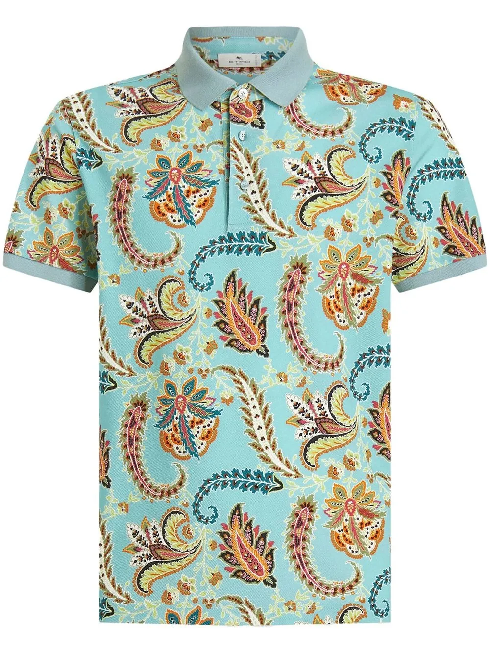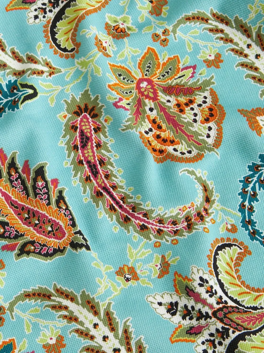 Grafischer Print, Poloshirtkragen, Knopfleiste vorne, kurze Ärmel, gerader Saum.
