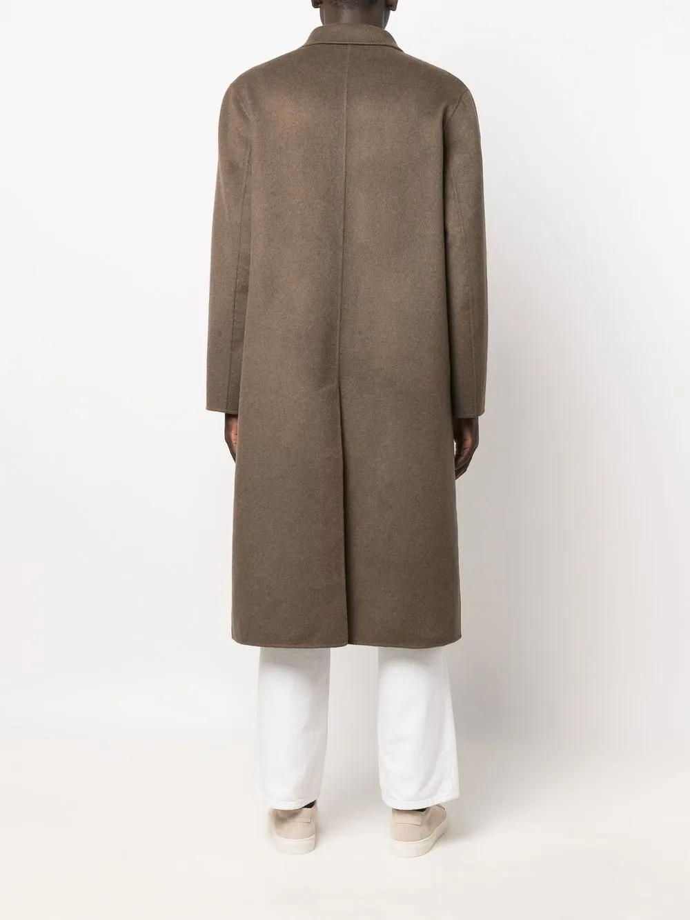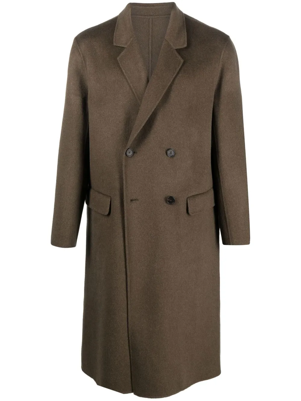 Klassisches Revers, doppelreihiger Knopfverschluss, lange Ärmel, zwei Pattentaschen vorne, Midi-Länge.
