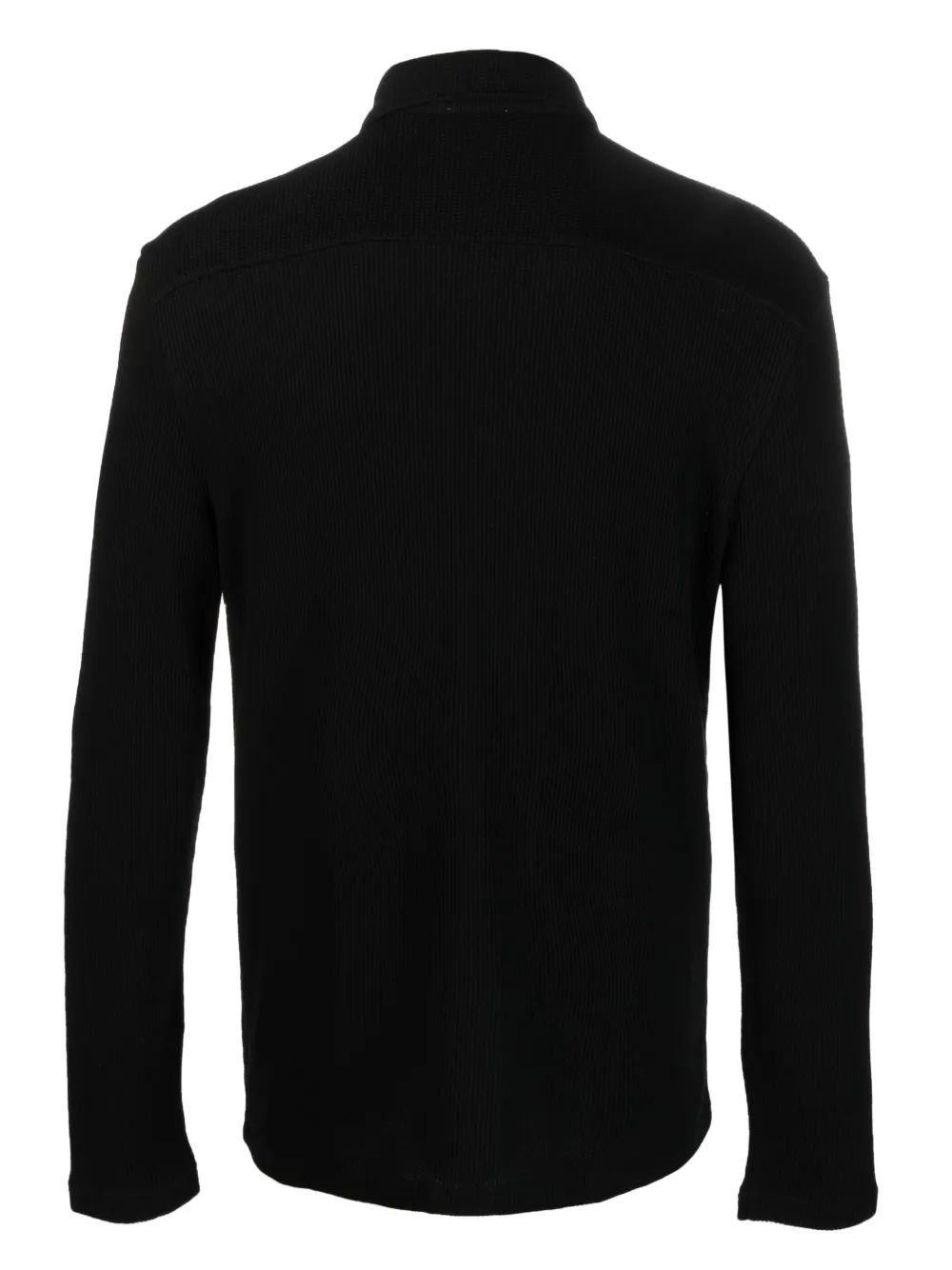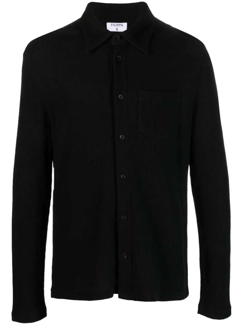 Schwarz, Bio-Baumwolle, Waffeloptik, klassischer Kragen, Knopfverschluss vorne, lange Ärmel, aufgesetzte Brusttasche, abgerundeter Saum hinten. Dieser Artikel besteht zu mindestens 50% aus Bio-Materialien.. Die Kriterien für diese Kategorie finden Sie auf unserer ‚Conscious‘-Seite.