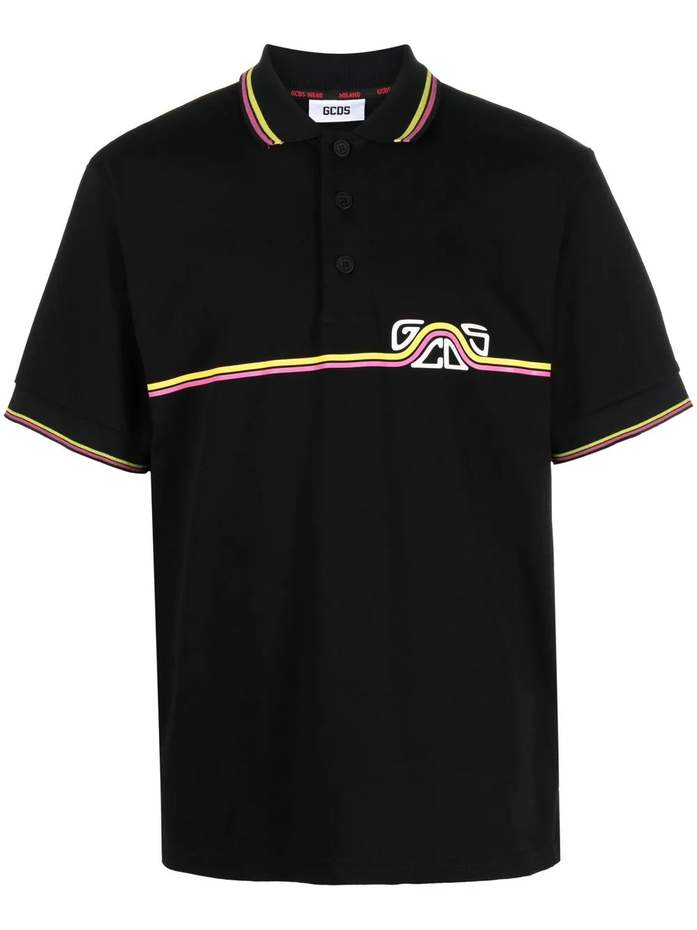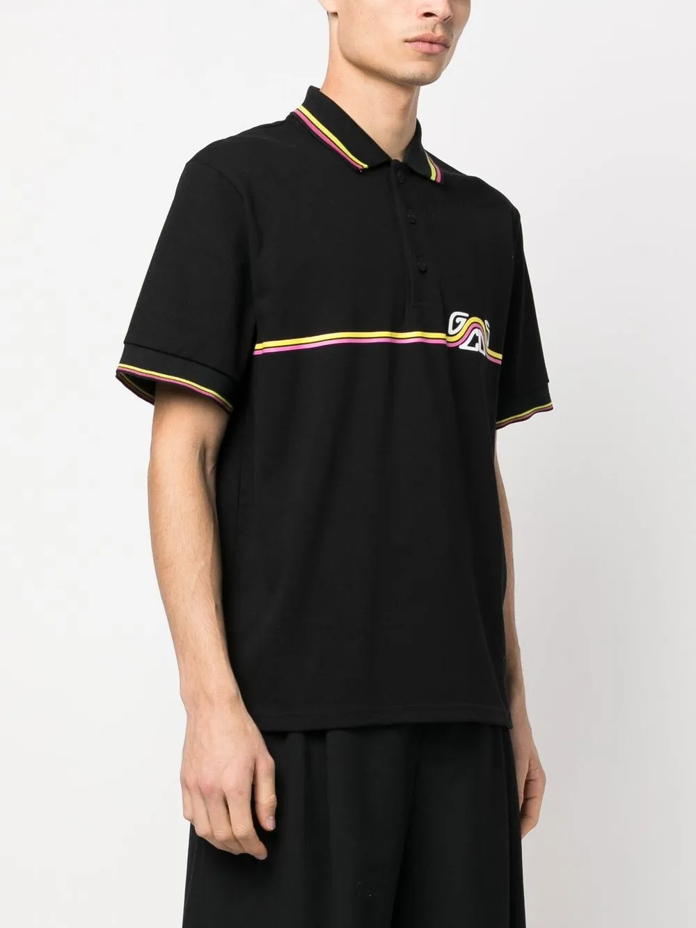 Schwarz/Bunt, Baumwolle, Logo-Print an der Brust, Poloshirtkragen, Knopfleiste vorne, kurze Ärmel.