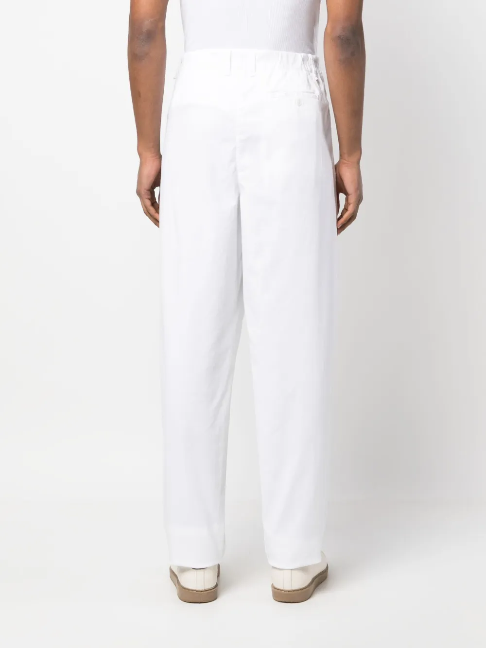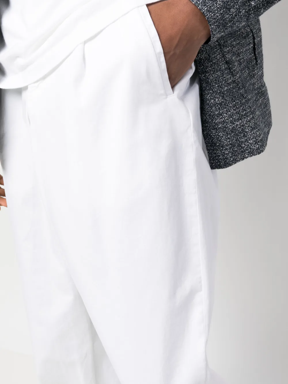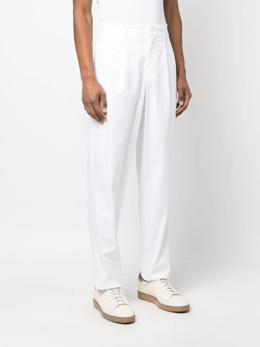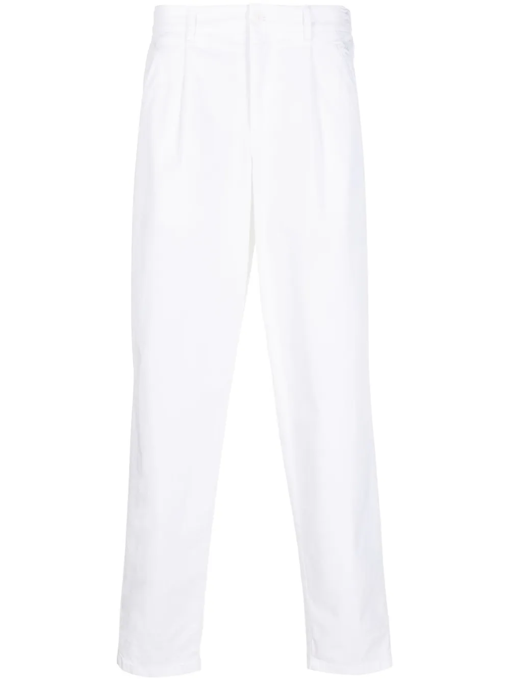Weiß, mittlere Taille, Gürtelschlaufen, Faltendetails, Beuteltaschen an der Seite, Gesäßtasche mit Knopfverschluss, Tapered-Bein.