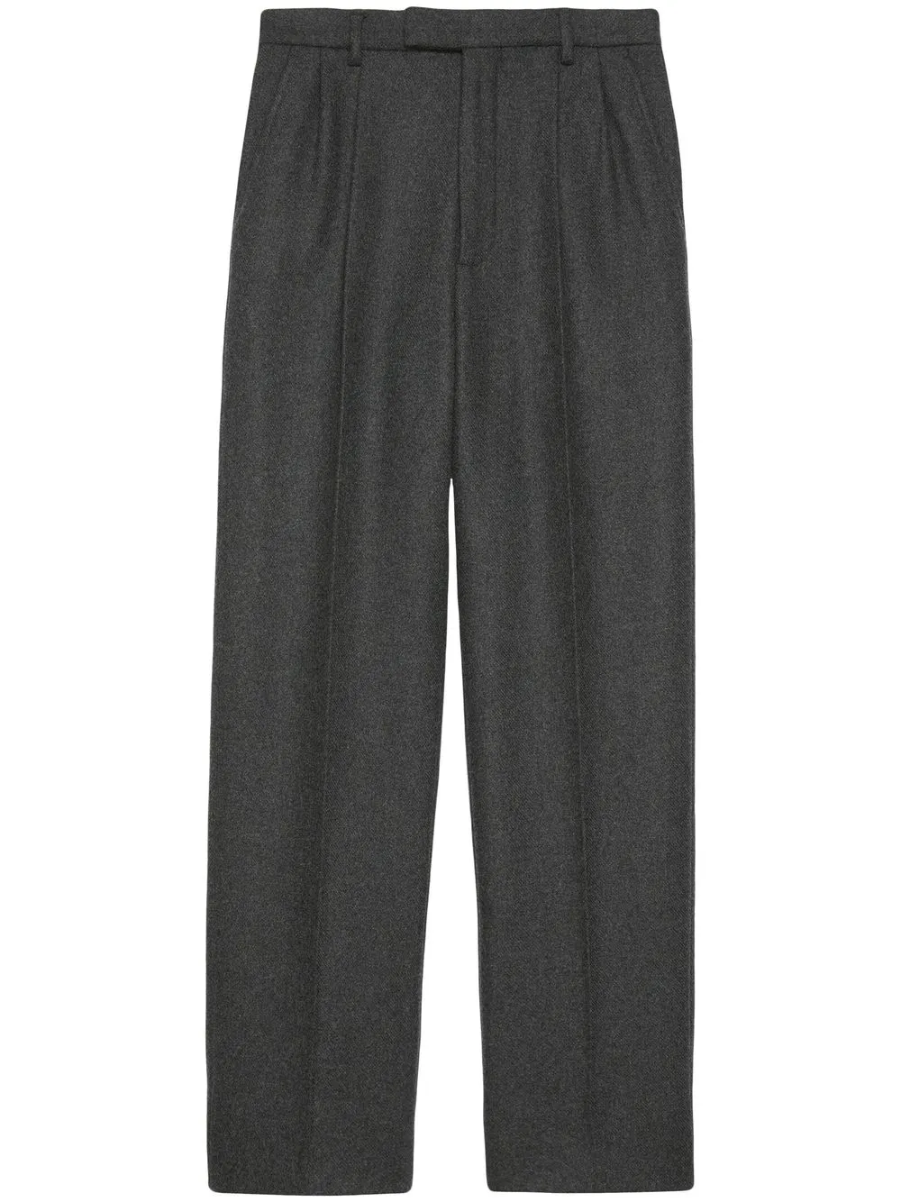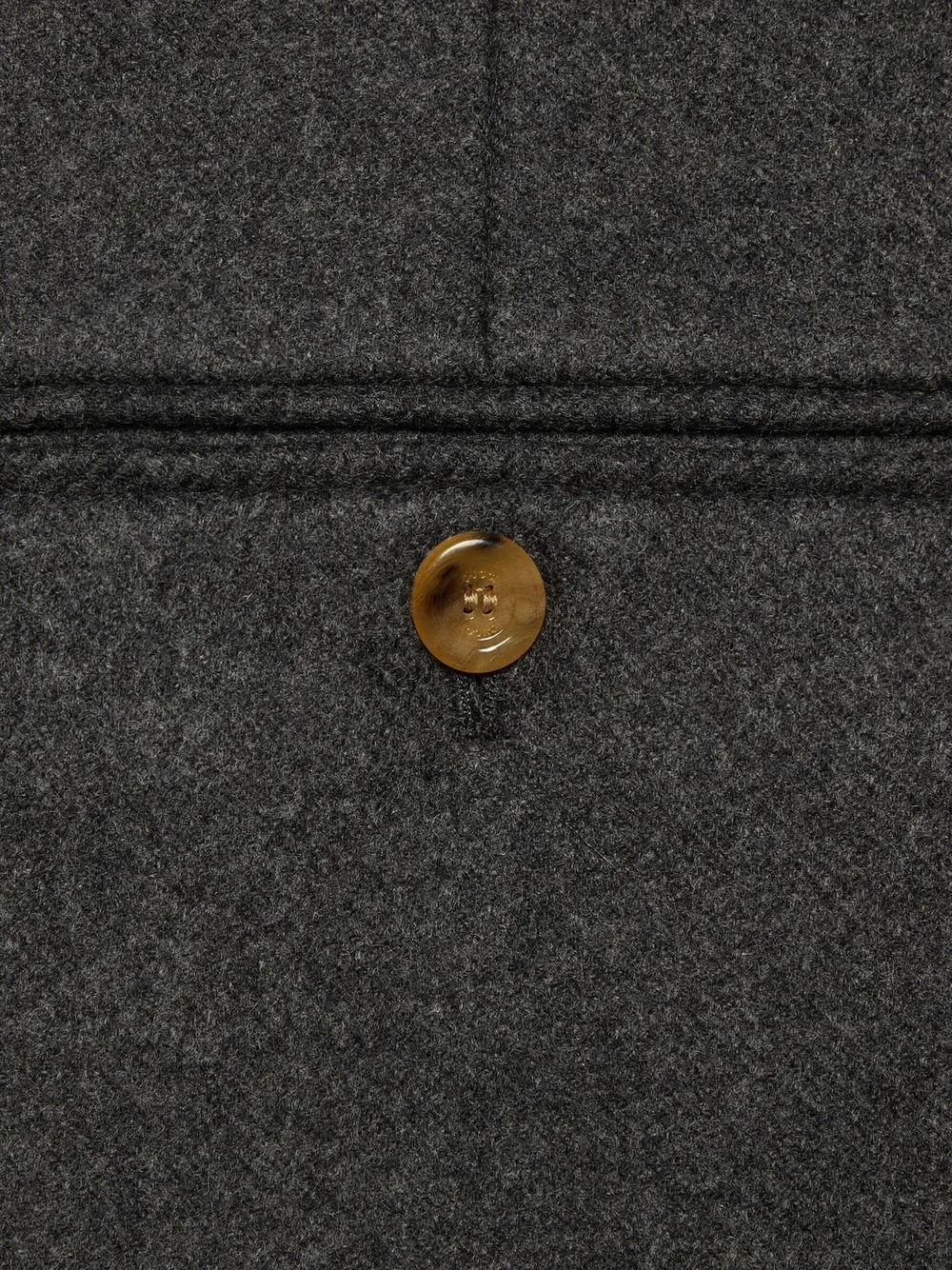Grau, Kaschmir, taillenhoher Schnitt, Gürtelschlaufen, verdeckter Verschluss vorne, Beuteltaschen an der Seite, zwei Eingrifftaschen mit Knopfverschluss hinten, Bügelfalte, gerades Bein.