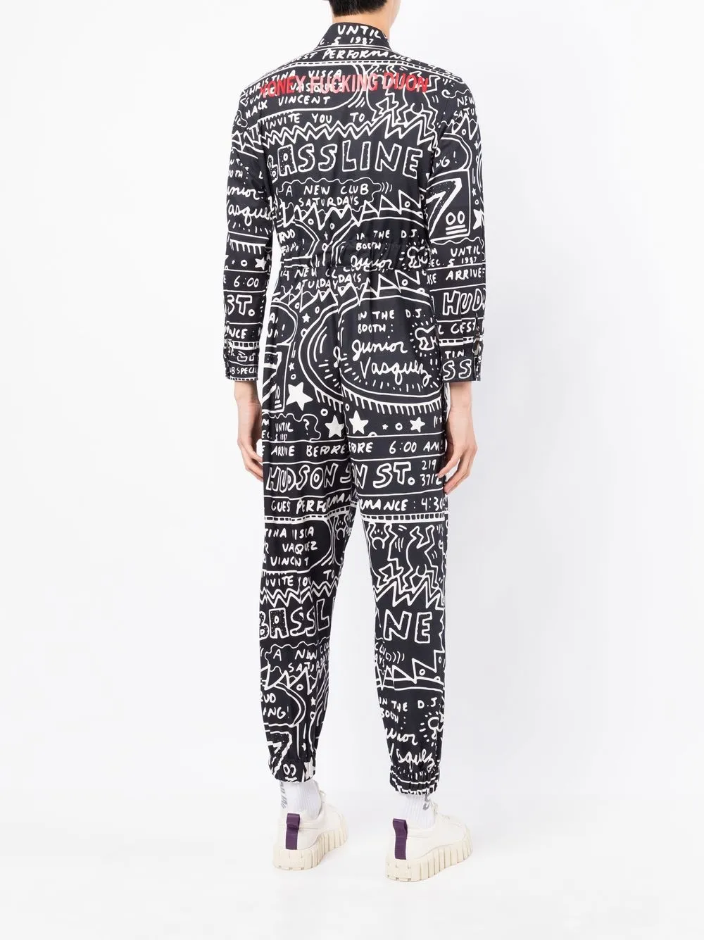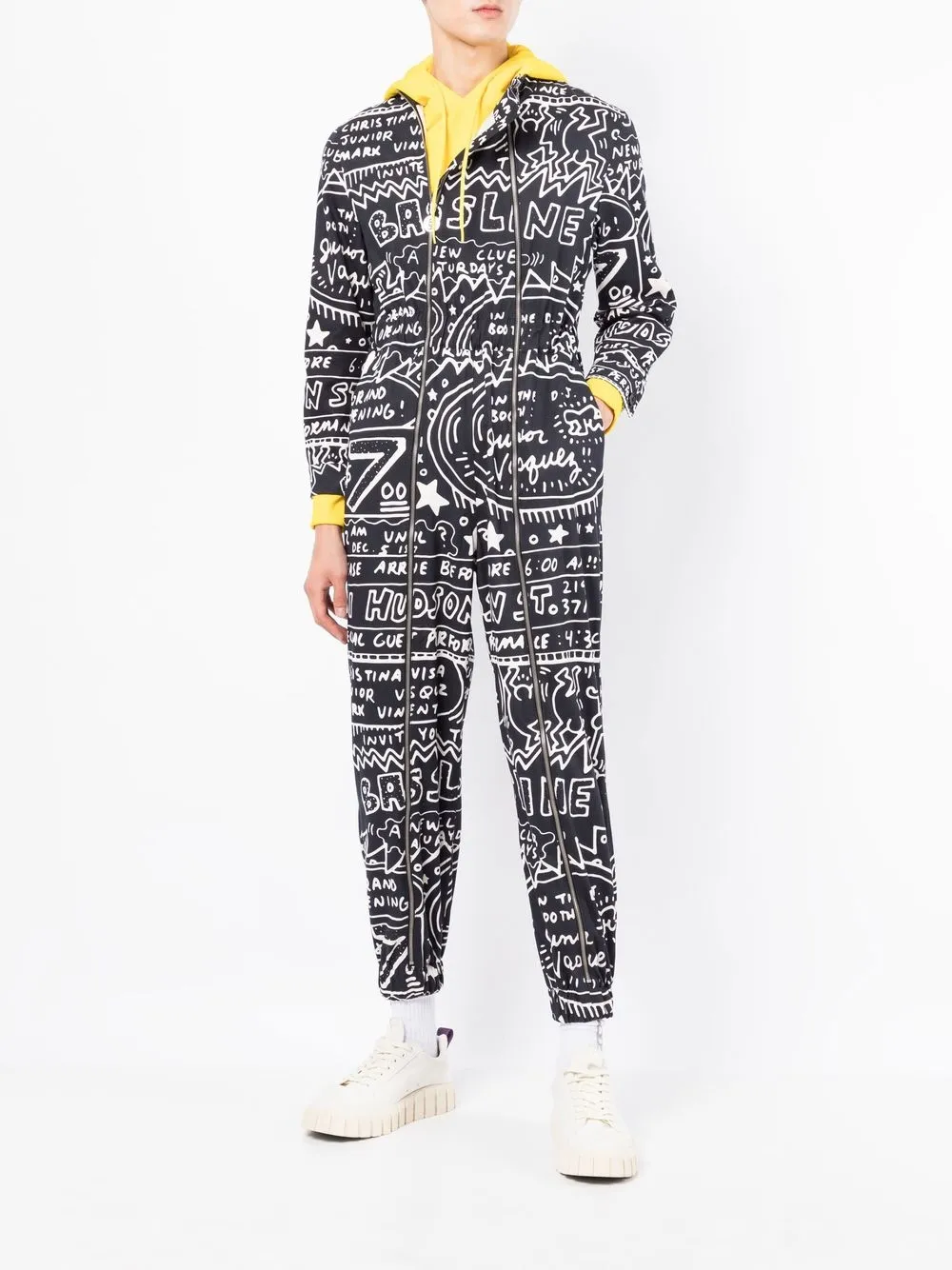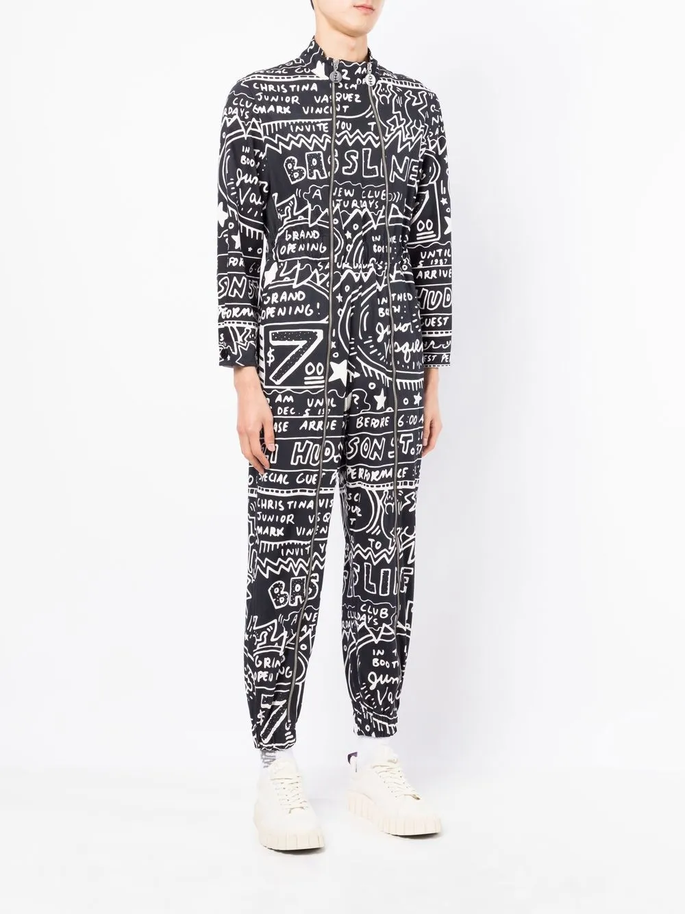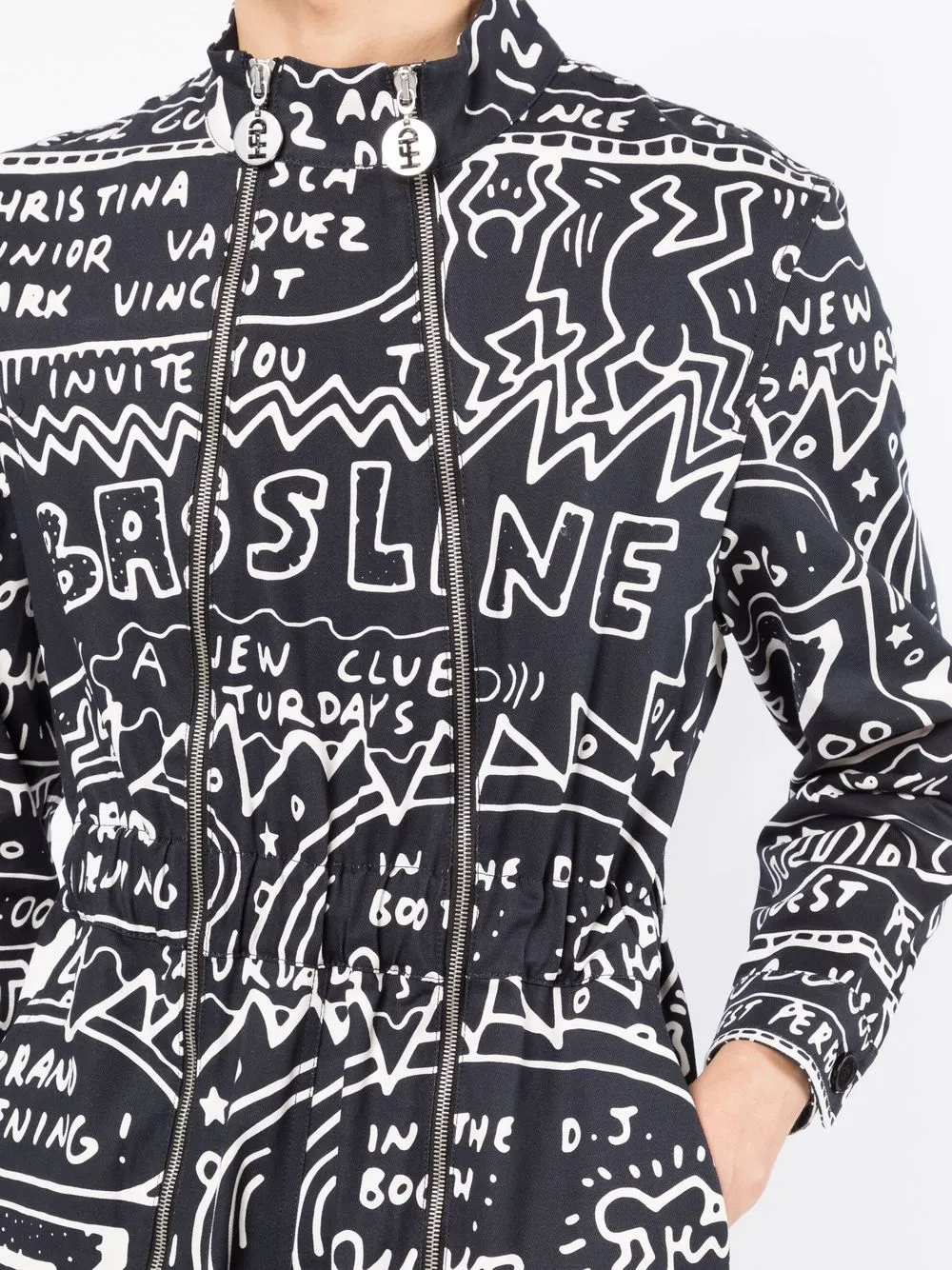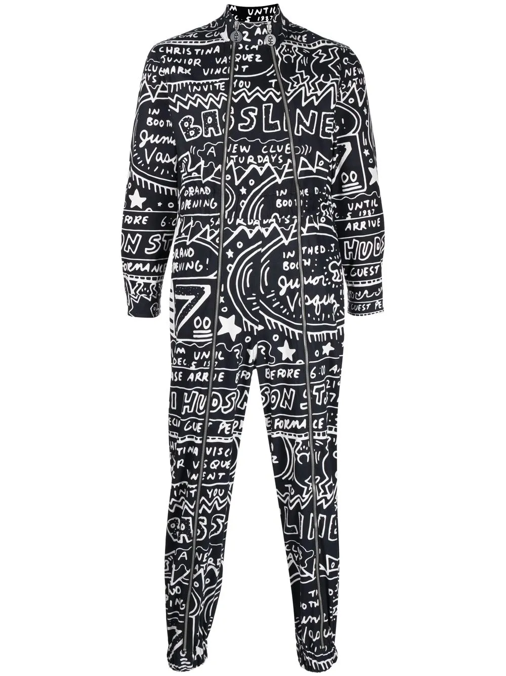Schwarz, Baumwolle, grafischer Print, kurzer Stehkragen, doppelreihiger Reißverschluss vorne, lange Ärmel, elastischer Bund, schmaler Schnitt, elastische Bündchen am Knöchel.