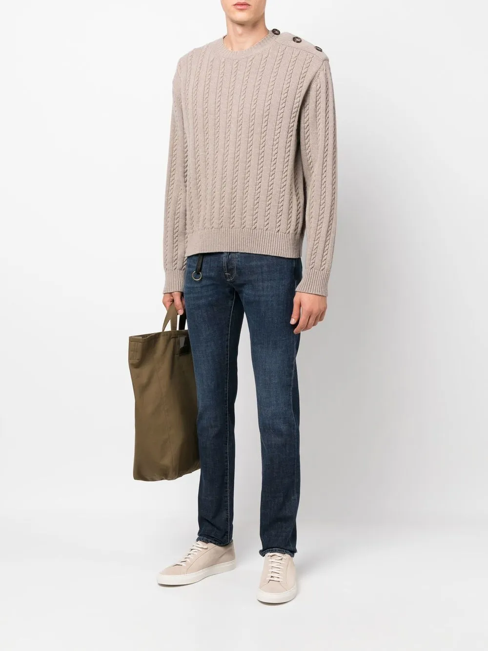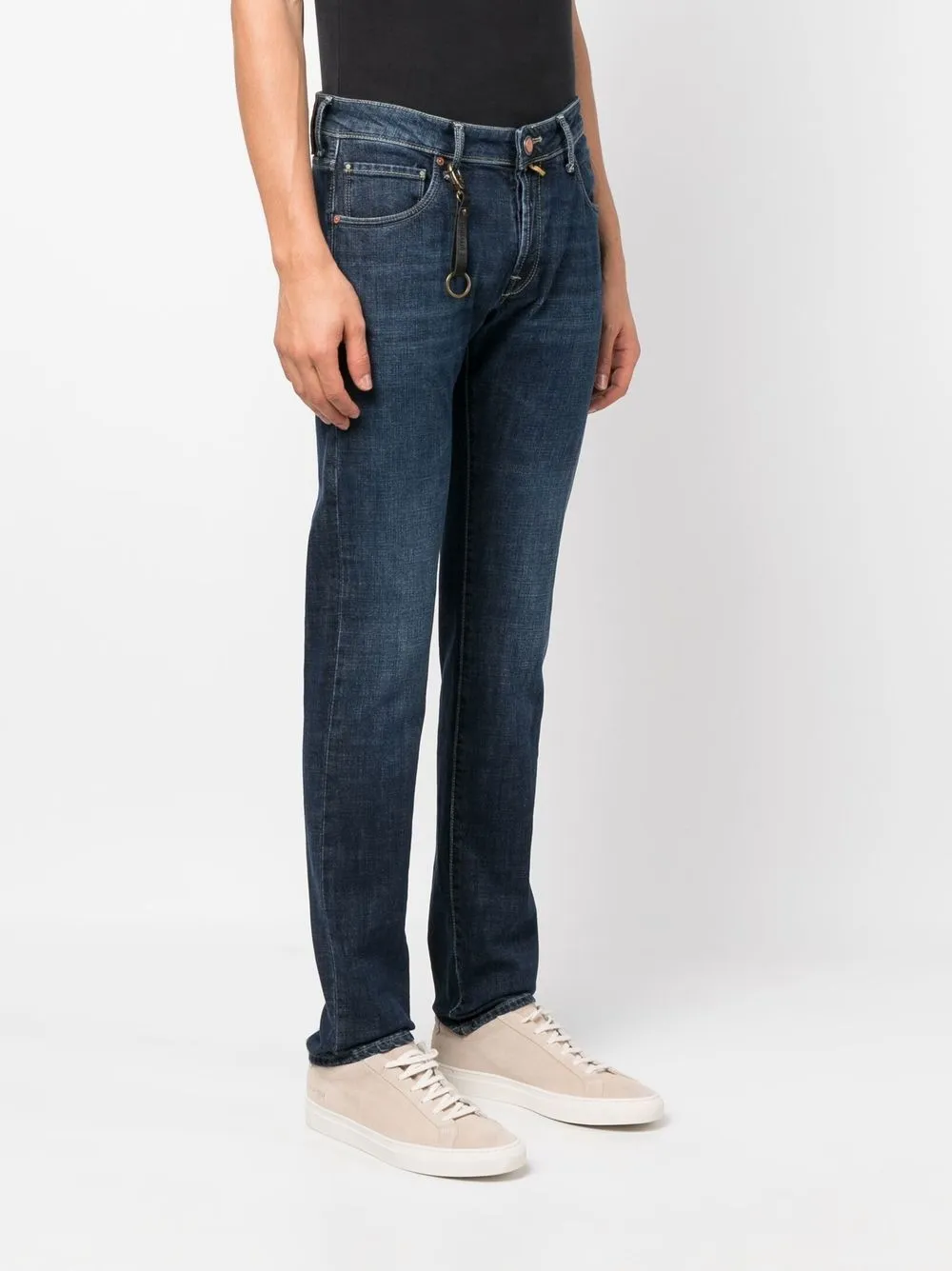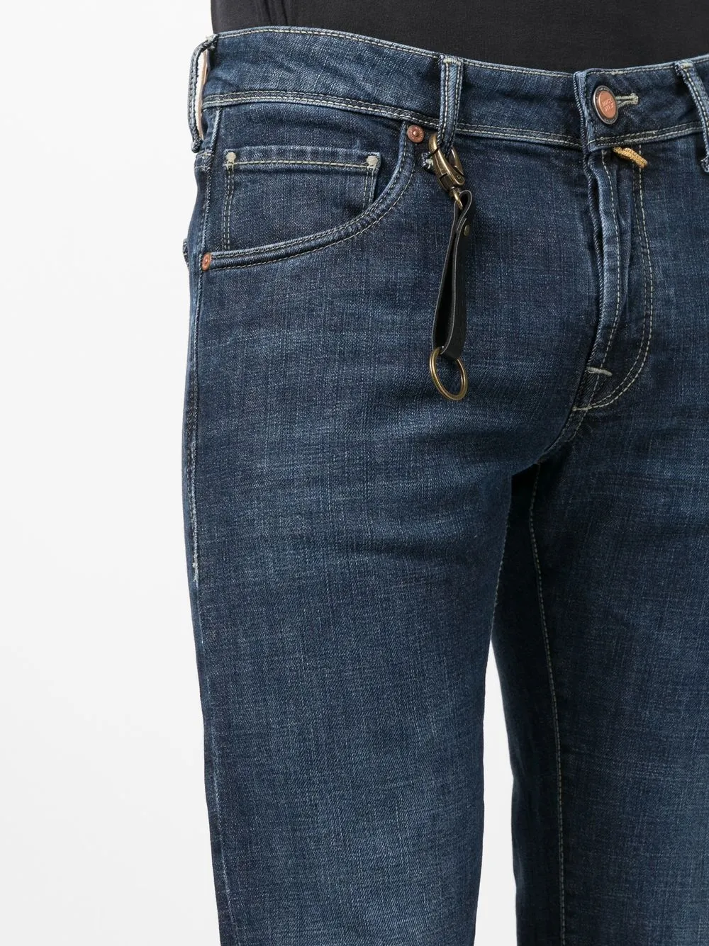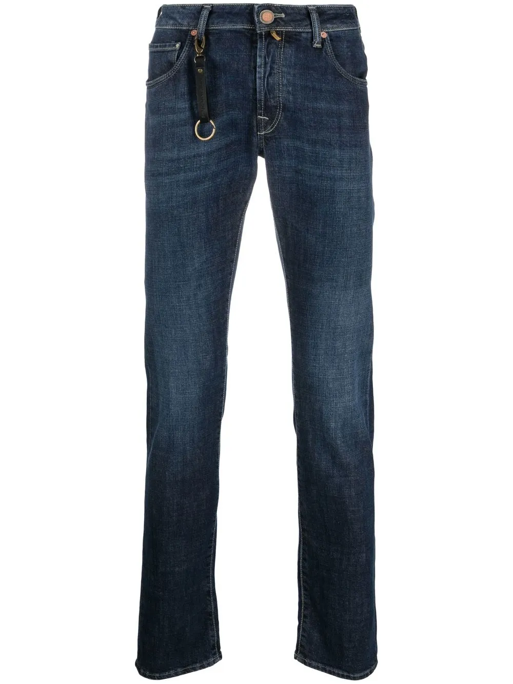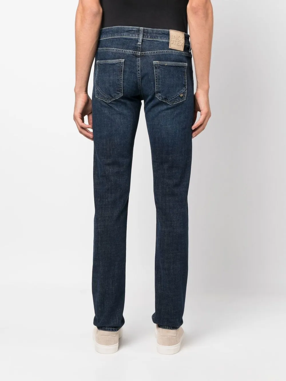 Indigoblau, gewaschener Denim, schmaler Schnitt, Logo-Patch hinten, Knopf- und Reißverschluss vorne, Gürtelschlaufen, Five-Pocket-Design.