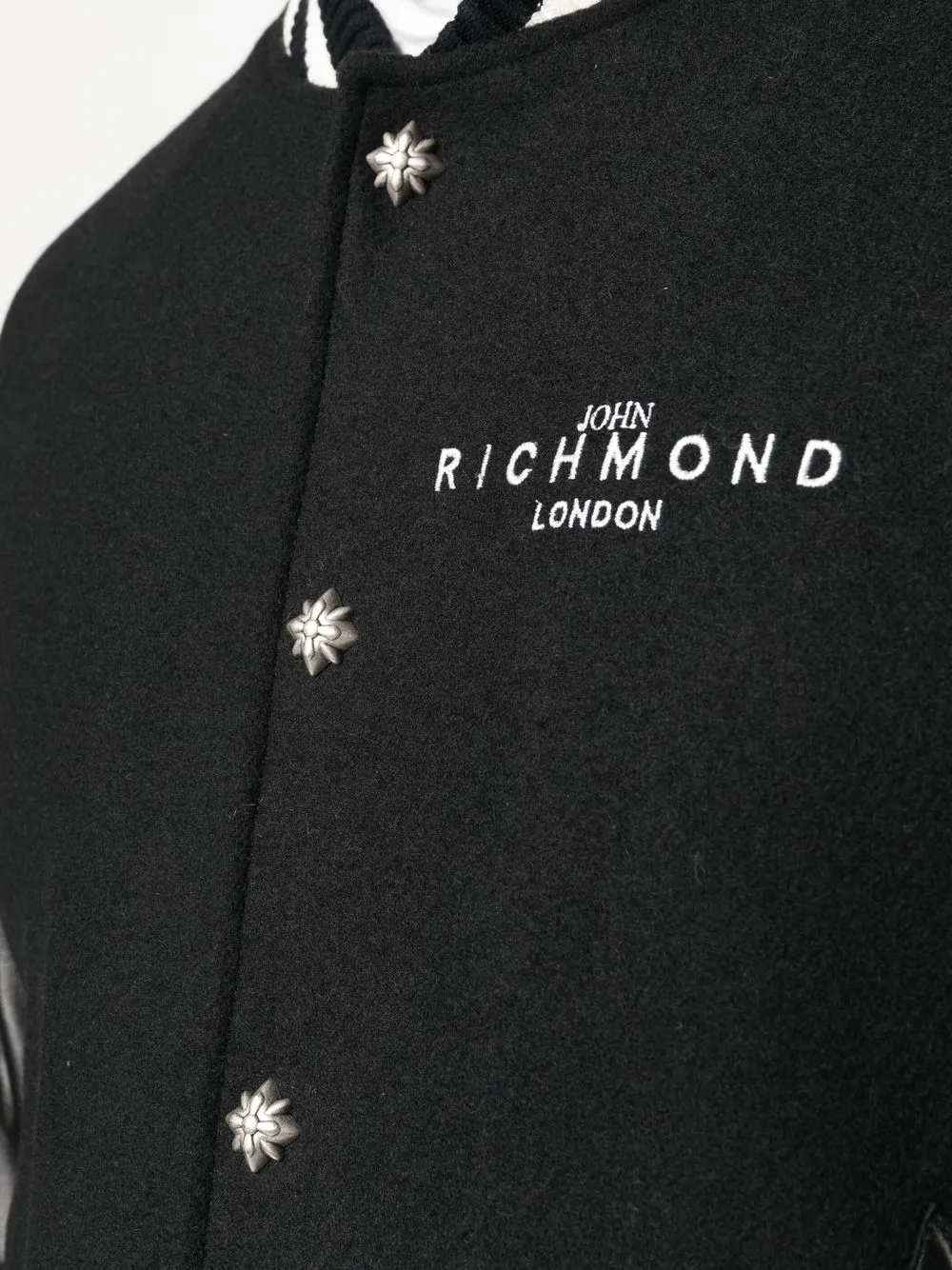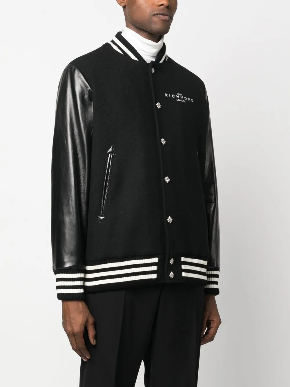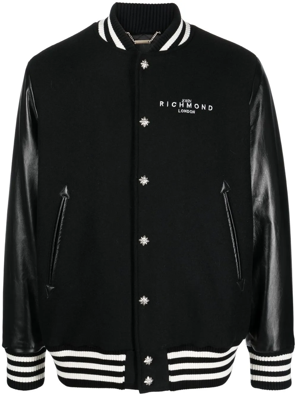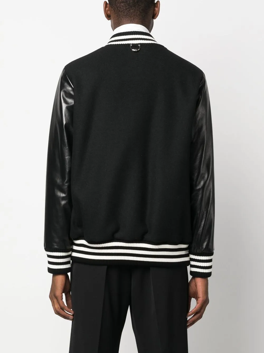 Schwarz/Weiß, Wolle, Leder, Logo-Print an der Brust, gestreifte Details, Baseball-Kragen, Druckknopfverschluss, lange Ärmel, elastische Bündchen, zwei seitliche Eingrifftaschen.