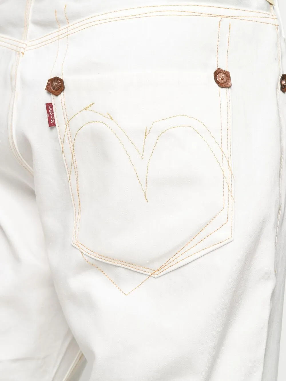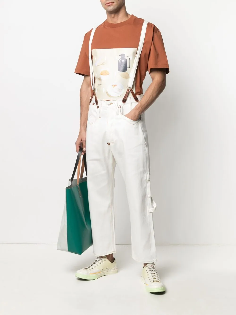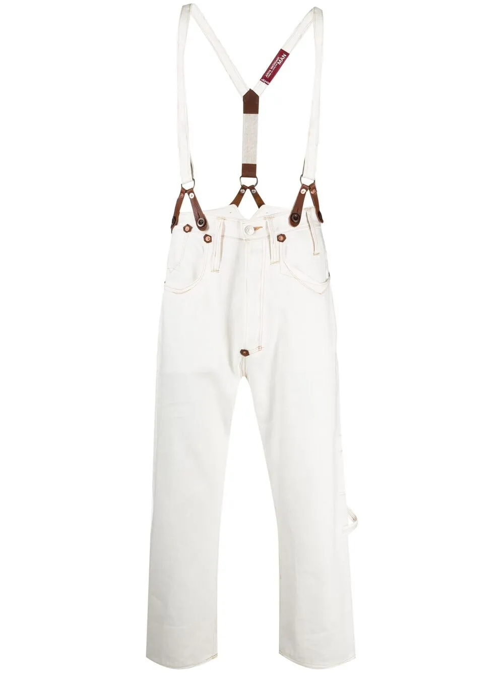 Gerades Bein, Knopfverschluss, Gürtelschlaufen, Five-Pocket-Design, verstellbare Träger. Farbe: Weiß.